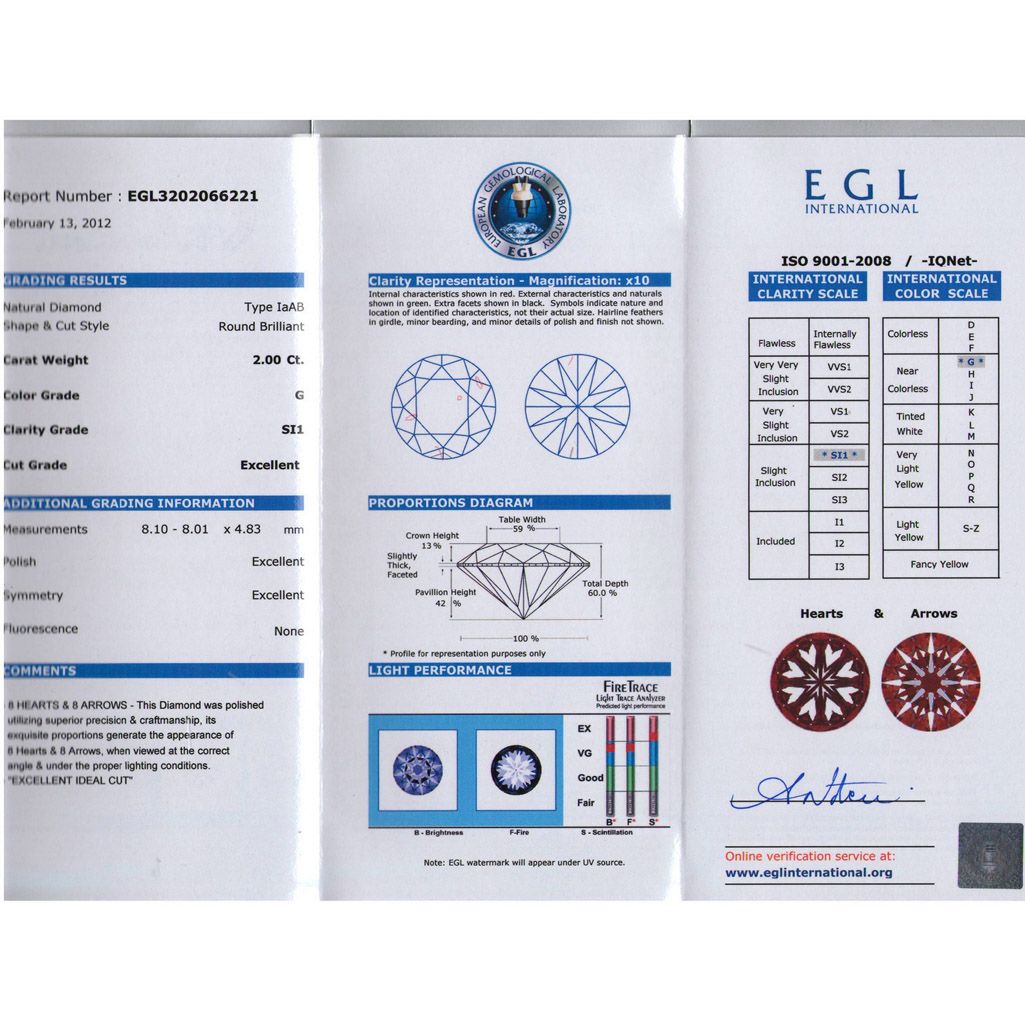 Certified Round Diamond 2.00ct, G, SI1, EGL ISRAEL **|**|** Shape: Round ; CTW: 2.00 ; Color: G ; Clarity: SI1 ; Certification: EGL ISRAEL ; Pol: ; Sym: X ; Flour: ; Meas: 8.01-8.10x4.83 ; Depth: ; Table: 59 ; Comment: EXCELLENT IDEAL CUT ; MSRP: $35500