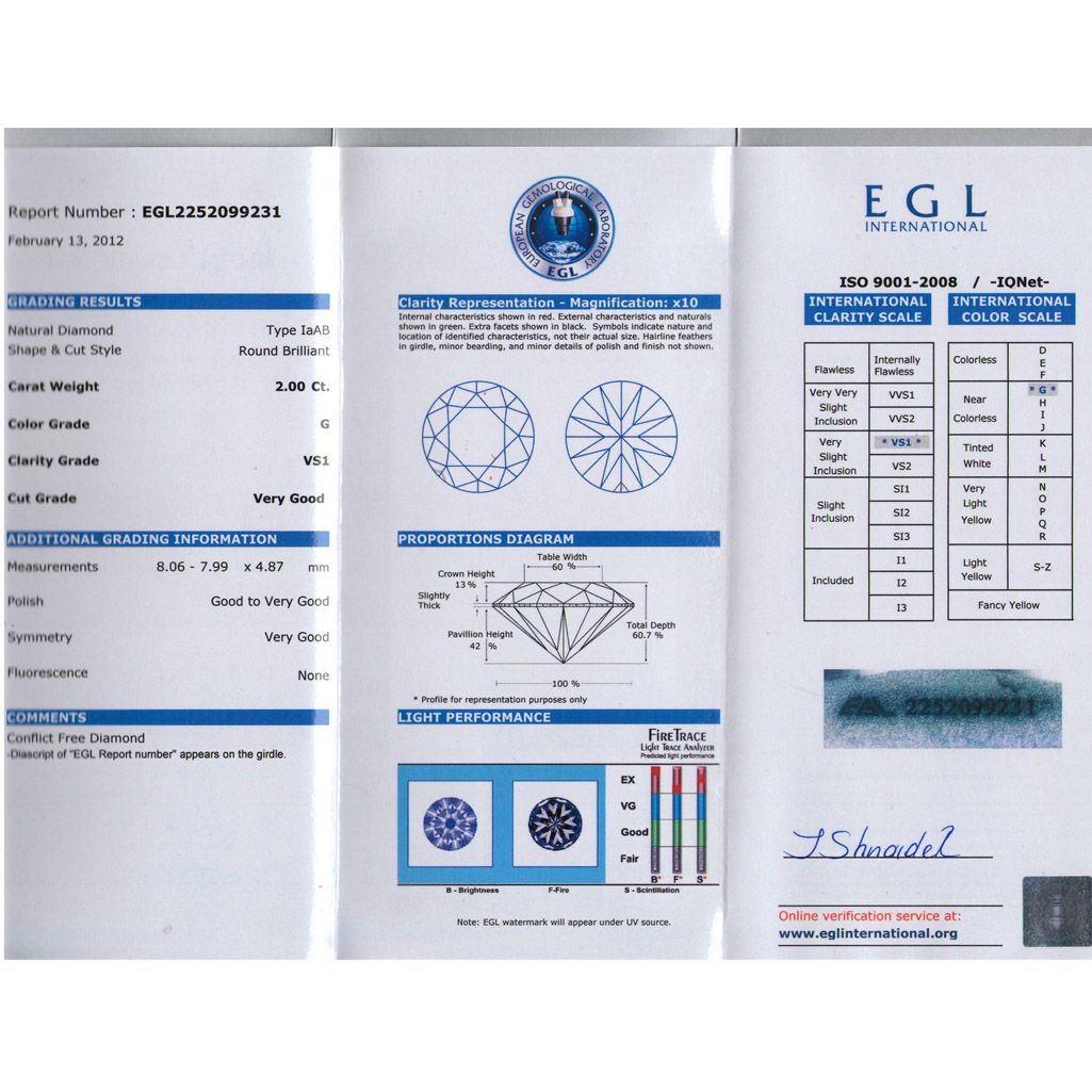 Certified Round Diamond 2.00ct, G, VS1, EGL ISRAEL **|**|** Shape: Round ; CTW: 2.00 ; Color: G ; Clarity: VS1 ; Certification: EGL ISRAEL ; Pol: ; Sym: VG ; Flour: ; Meas: 7.99-8.06x4.87 ; Depth: ; Table: 60 ; Girdle: SL THK ; Comment: TRIPLE VG ; MSRP: $49100