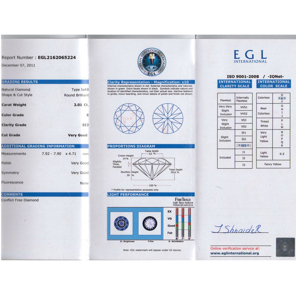Certified Round Diamond 2.01ct, E, SI3, EGL ISRAEL **|**|** Shape: Round ; CTW: 2.01 ; Color: E ; Clarity: SI3 ; Certification: EGL ISRAEL ; Pol: ; Sym: VG ; Flour: ; Meas: 7.90-7.92x4.71 ; Depth: ; Table: 63 ; Girdle: SL THK ; Comment: SUPER 0LUFF, SUPER 0UY ; MSRP: $19800