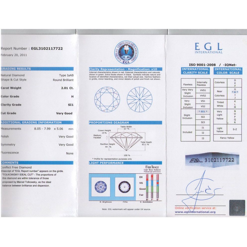Certified Round Diamond 2.01ct H, SI1, EGL ISRAEL **|**|** Shape: Round ; CTW: 2.01 ; Color: H ; Clarity: SI1 ; Certification: EGL ISRAEL ; Sym: VG ; Flour: ; Meas: 7.99-8.05x5.06 ; Depth: ; Table: 57 ; Girdle: MED ; Comment: TOLKOWSKY IDEAL CUT ; MSRP: $34500