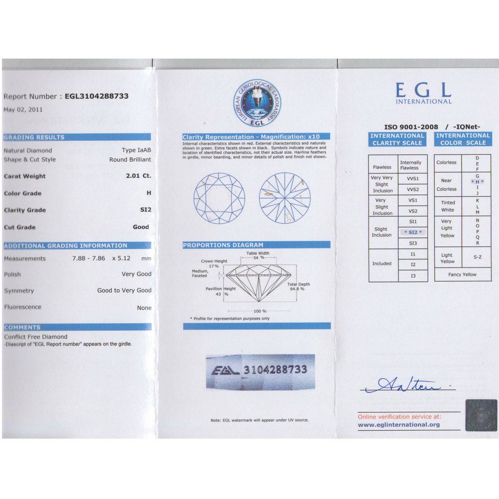 Certified Round Diamond 2.01ct H, SI2, EGL ISRAEL **|**|** Shape: Round ; CTW: 2.01 ; Color: H ; Clarity: SI2 ; Certification: EGL ISRAEL ; Pol: ; Sym: VG ; Flour: ; Meas: 7.86-7.88x5.12 ; Depth: ; Table: 54 ; Girdle: MED ; Comment: EYECLEANISH, FULL OF LIFE ; MSRP: $26300