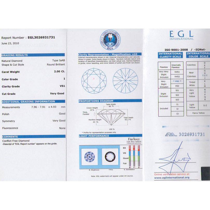 Certified Round Diamond 2.0ct, I, VS1, EGL ISRAEL **|**|** Shape: Round ; CTW: 2 ; Color: I ; Clarity: VS1 ; Certification: EGL ISRAEL ; Pol: ; Sym: G ; Flour: ; Meas: 7.91-7.96x4.93 ; Depth: ; Table: 60 ; Comment: WHITE ; MSRP: $33500