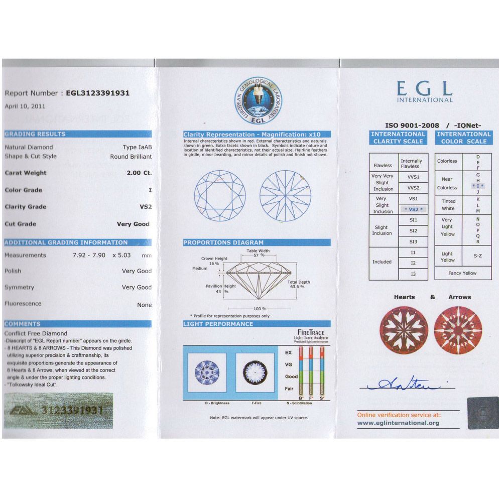 Certified Round Diamond 2.0ct, I, VS2, EGL ISRAEL **|**|** Shape: Round ; CTW: 2 ; Color: I ; Clarity: VS2 ; Certification: EGL ISRAEL ; Pol: ; Sym: VG ; Flour: ; Meas: 7.90-7.92x5.03 ; Depth: ; Table: 57 ; Girdle: MED ; Comment: TOLKOWSKY IDEAL CUT + H & A ; MSRP: $31400