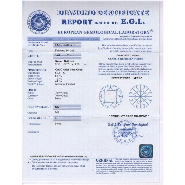 Certified Round Diamond 3.01ct H, SI2, EGL ISRAEL **|**|** Shape: Round ; CTW: 3.01 ; Color: H ; Clarity: SI2 ; Certification: EGL ISRAEL ; Sym: VG ; Flour: ; Meas: 9.25-9.30x5.60 ; Depth: ; Table: 63 ; Girdle: MED ; Comment: EYECLEANISH ; MSRP: $51400