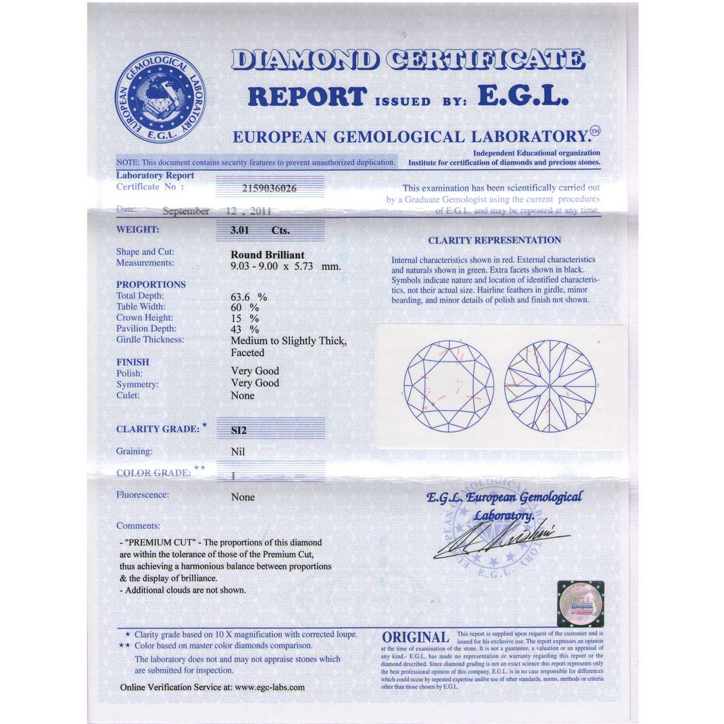 Certified Round Diamond 3.01ct I, SI2 EGL ISRAEL **|**|** Shape: Round ; CTW: 3.01 ; Color: I ; Clarity: SI2 ; Certification: EGL ISRAEL ; Sym: VG ; Flour: ; Meas: 9.00-9.03x5.73 ; Depth: ; Table: 60 ; Girdle: MED ; Comment: WHITE & EYECLEAN ; MSRP: $38700