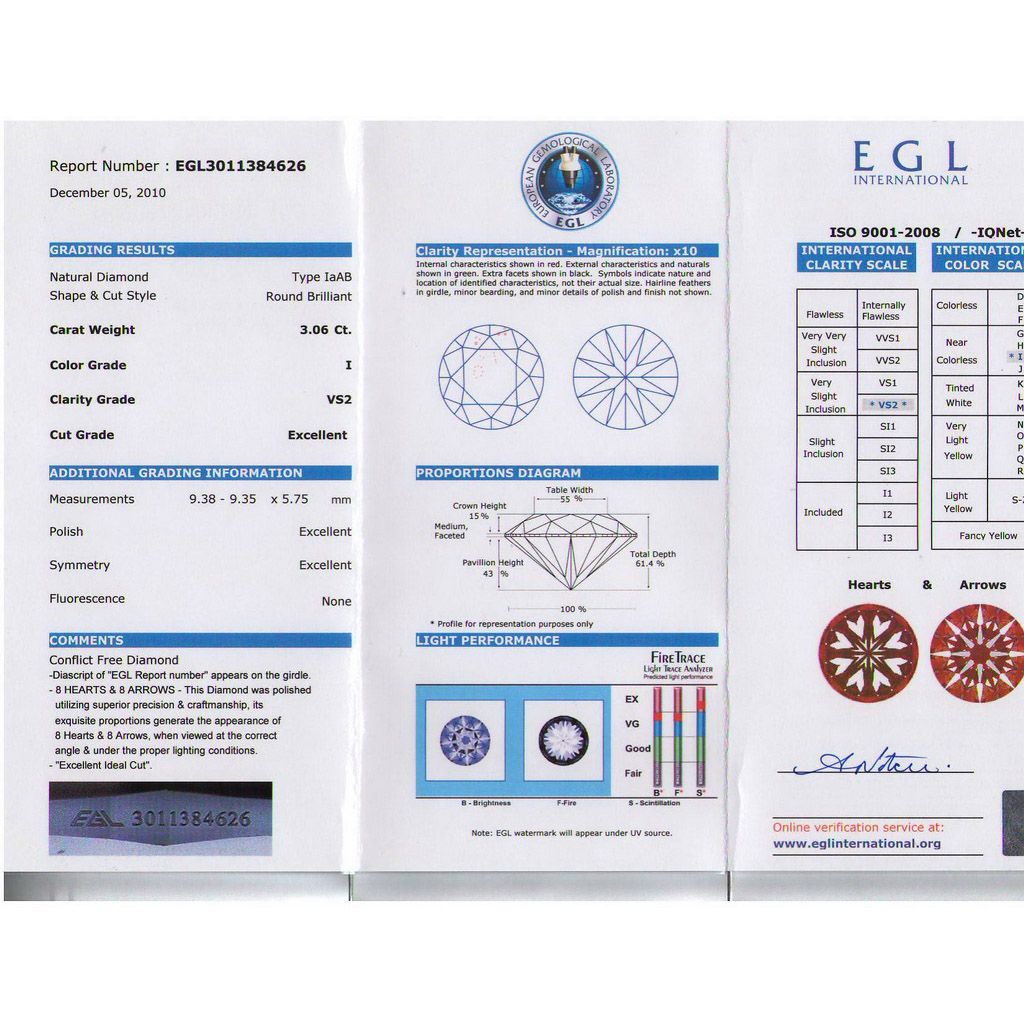 Certified Round Diamond 3.06ct I, VS2 EGL ISRAEL **|**|** Shape: Round ; CTW: 3.06 ; Color: I ; Clarity: VS2 ; Certification: EGL ISRAEL ; Pol: ; Sym: X ; Flour: ; Meas: 9.35-9.38x5.75 ; Depth: ; Table: 55 ; Girdle: MED ; Comment: EXCELLENT IDEAL CUT, SUPER 0UY ; MSRP: $64900