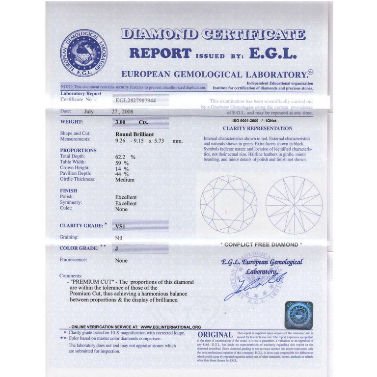 Certified Round Diamond 3.0ct J, VS1, EGL ISRAEL **|**|** Shape: Round ; CTW: 3 ; Color: J ; Clarity: VS1 ; Certification: EGL ISRAEL ; Sym: X ; Flour: ; Meas: 9.15-9.26x5.73 ; Depth: ; Table: 59 ; Girdle: MED ; Comment: WHITE PREMIUM CUT ; MSRP: $67600