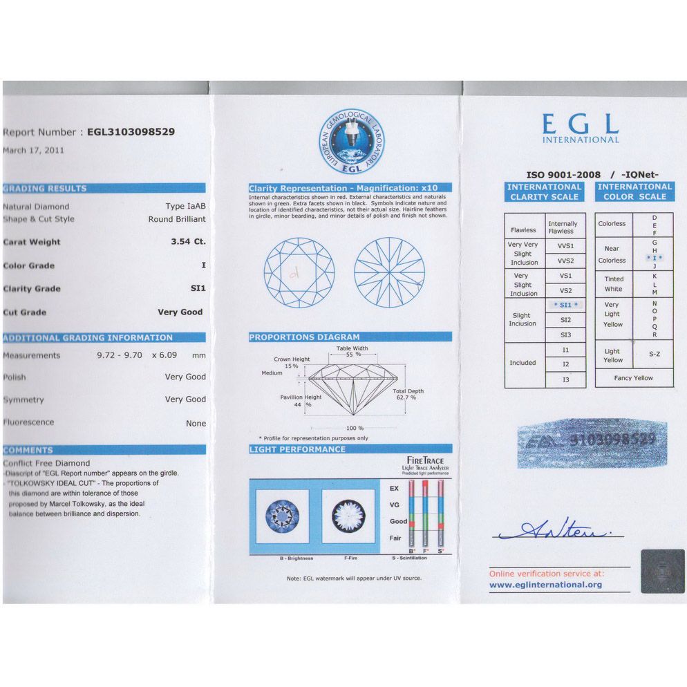 Certified Round Diamond 3.54ct I, SI1 EGL ISRAEL **|**|** Shape: Round ; CTW: 3.54 ; Color: I ; Clarity: SI1 ; Certification: EGL ISRAEL ; Pol: ; Sym: VG ; Flour: ; Meas: 9.70-9.72x6.09 ; Depth: ; Table: 55 ; Girdle: MED ; Comment: SUPER WHITE, TOLKOWSKY IDEAL CUT ; MSRP: $63900