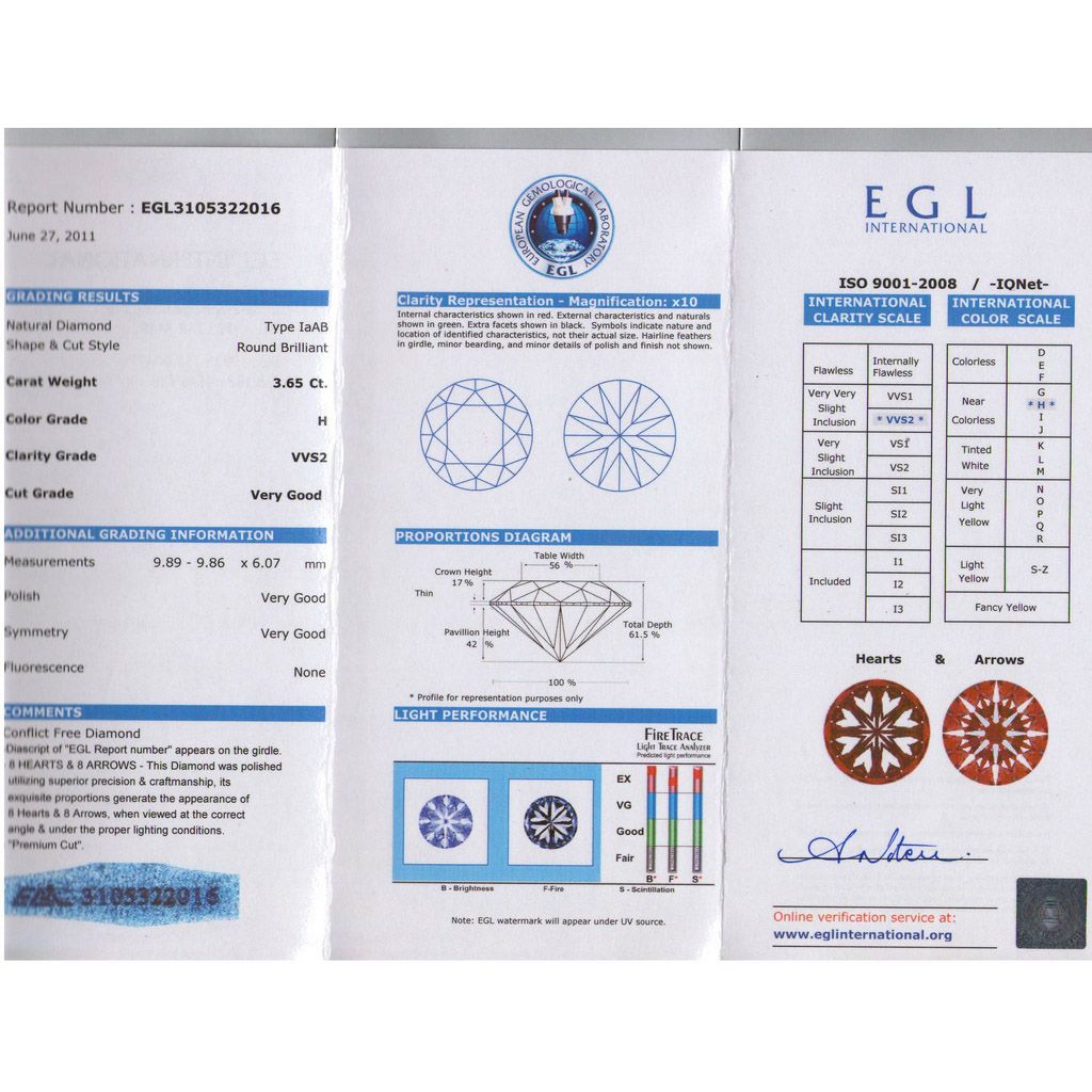 Certified Round Diamond 3.65ct H, VVS2 EGL ISRAEL **|**|** Shape: Round ; CTW: 3.65 ; Color: H ; Clarity: VVS2 ; Certification: EGL ISRAEL ; Pol: ; Sym: VG ; Flour: ; Meas: 9.86-9.89x6.07 ; Depth: ; Table: 56 ; Girdle: THN ; Comment: PREMIUM CUT+ H&A ; MSRP: $150100