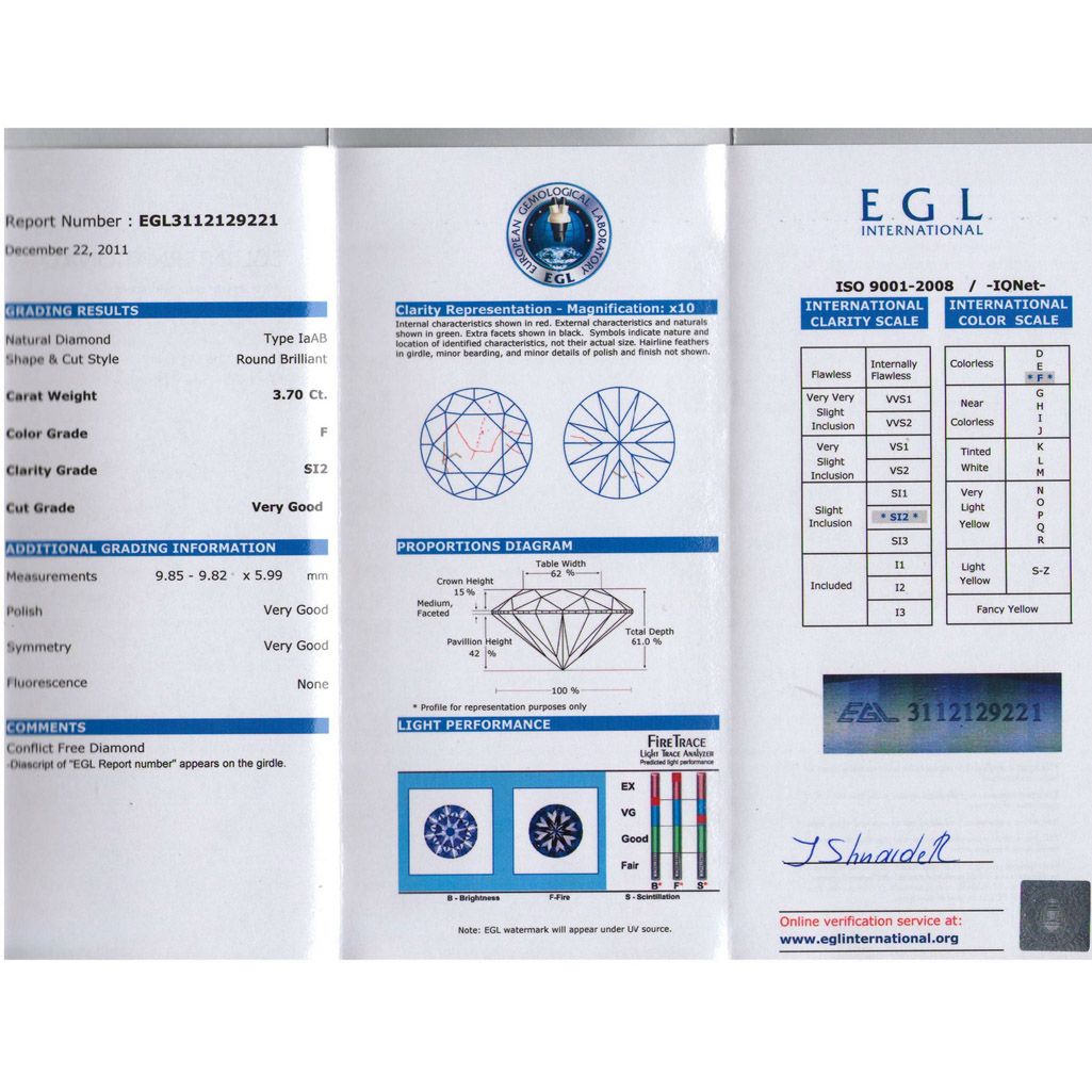 Certified Round Diamond 3.70 ct F, SI2 EGL ISRAEL **|**|** Shape: Round ; CTW: 3.7 ; Color: F ; Clarity: SI2 ; Certification: EGL ISRAEL ; Pol: ; Sym: VG ; Flour: ; Meas: 9.82-9.85x5.99 ; Depth: ; Table: 62 ; Girdle: MED ; Comment: GREAT 0LUFF STONE ; MSRP: $75800