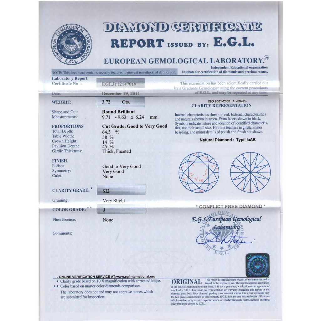 Certified Round Diamond 3.72ct J, SI2 EGL ISRAEL **|**|** Shape: Round ; CTW: 3.72 ; Color: J ; Clarity: SI2 ; Certification: EGL ISRAEL ; Pol: ; Sym: VG ; Flour: ; Meas: 9.63-9.71x6.24 ; Depth: ; Table: 58 ; Comment: WHITE & EYECLEAN ; MSRP: $50800