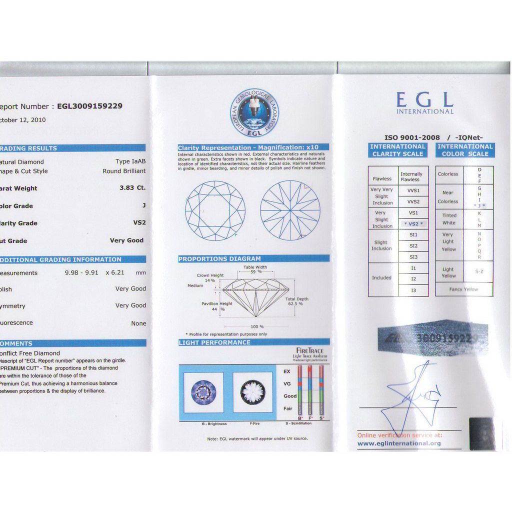 Certified Round Diamond 3.83ct J, VS2 EGL ISRAEL **|**|** Shape: Round ; CTW: 3.83 ; Color: J ; Clarity: VS2 ; Certification: EGL ISRAEL ; Pol: ; Sym: VG ; Flour: ; Meas: 9.91-9.98x6.21 ; Depth: ; Table: 59 ; Girdle: MED ; Comment: PREMIUM CUT ; MSRP: $83600