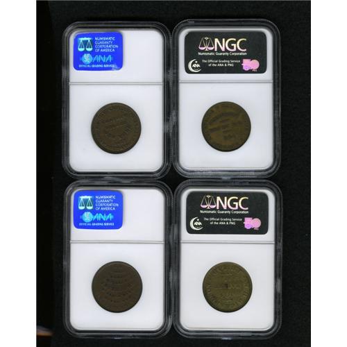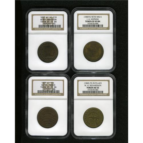 <B>Certified Token Group Lot.</B></I> Consists of two Hard Times tokens, an <B>1837 Nathl. March, Portsmouth, NH, HT-194, R.1, VF35 NGC;</B></I> and an <B>1837 Henry Anderson, New York, NY, HT-219, R.2, XF45 NGC.</B></I> Also includes two post-Hard Times merchant tokens, an <B>(1845) W.H. Richardson, Philadelphia, PA, Miller-PA-423, AU55 NGC,</B></I> brass; and an <B>(1850s) I.A. Hopkins, Milwaukee, WI, Miller-WI-5, XF45 NGC,</B></I> copper. Market value is about $120.<BR><BR><b>Shipping:</b> Coins & Currency (<a target="_blank" href="http://www.heritageauctions.com/common/shipping.php">view shipping information</a>)