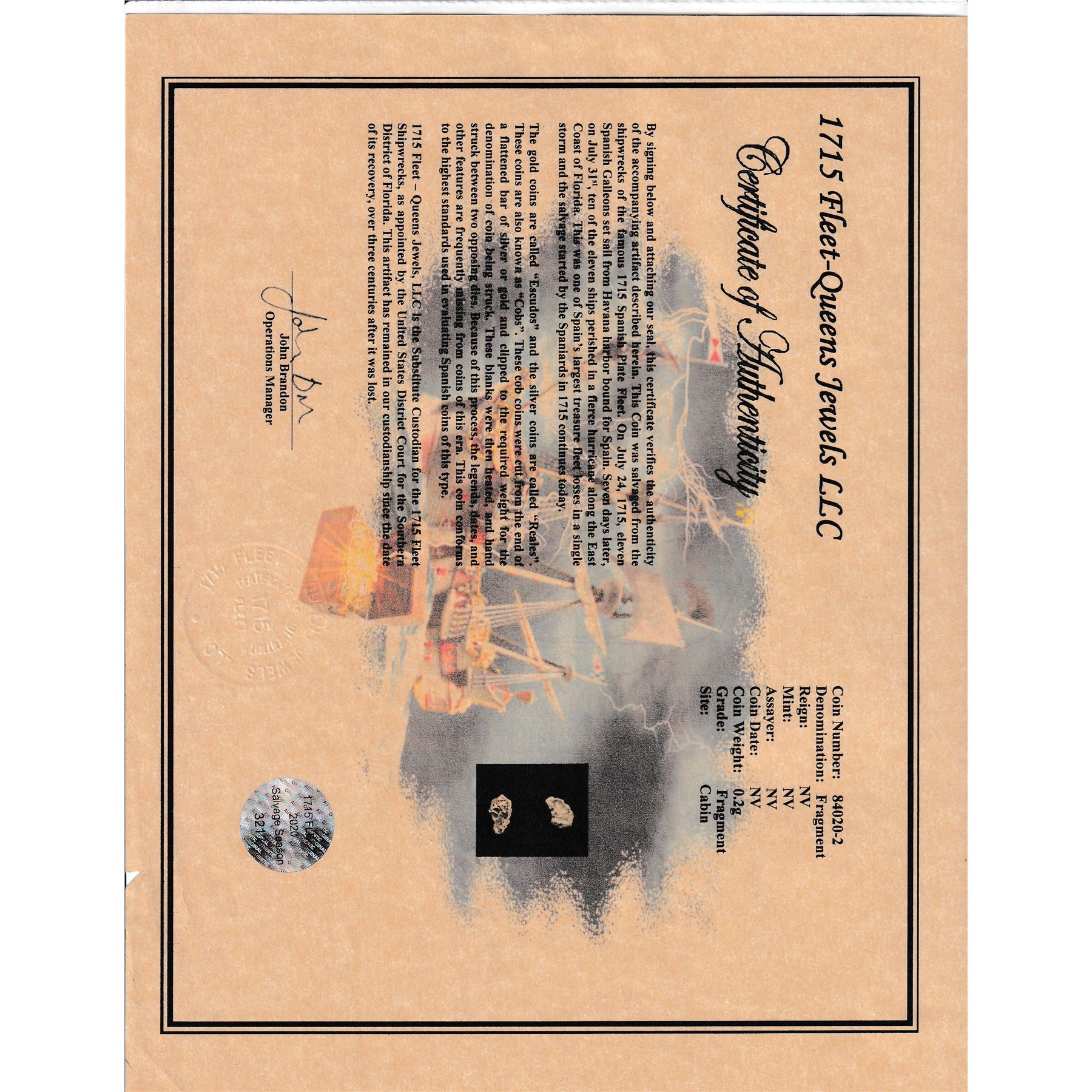 S/0.2-MSS TITLE DESCRIPTION: Certified Treasure Coin Fragment DESCRIPTION DETAIL: This coin was recovered by Queens Jewels at the Cabin wreck in the 2020 salvage season. This includes an original cert signed by John Brandon. Coin Number: 84020-2 Denomination: Fragment Reign: Philip NV Mint: NV Assayer: NV Coin Date: NV Coin Weight: 0.2g Grade: Fragment Site: Cabin PRIOR TO BIDDING READ THE DESCRIPTION, TERMS, AND CONDITIONS CAREFULLY This description and condition report is provided for your convenience based on the information provided by the consignor. CAA is not responsible for any discrepancies between this information and other opinions. Buyers Premium: 18% Payment Due in 5 days All items shipped to registered address - NO EXCEPTIONS S/0.2-MSS