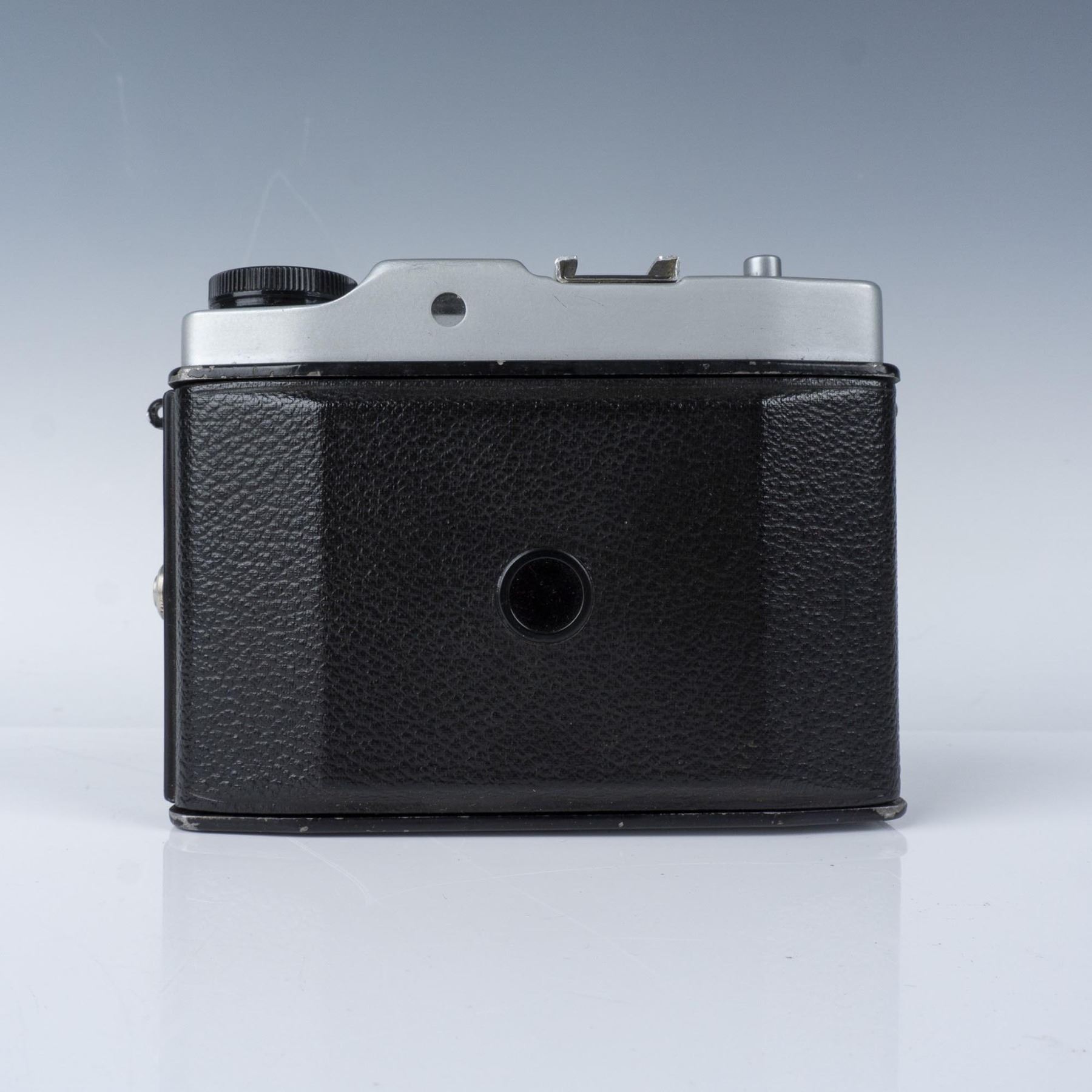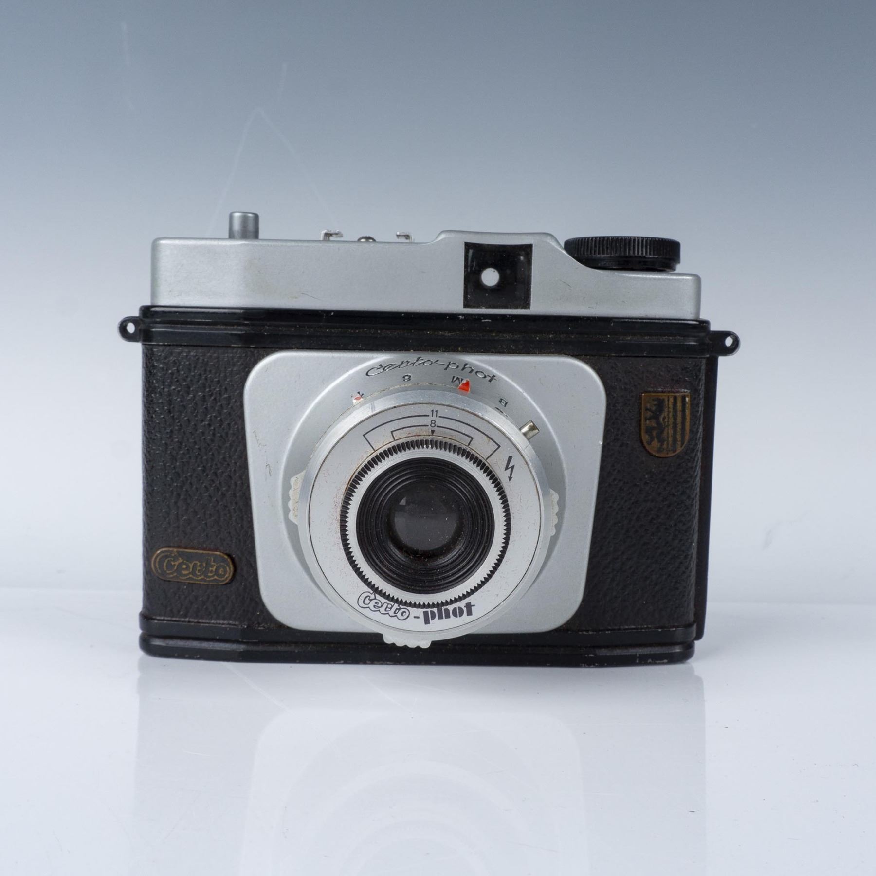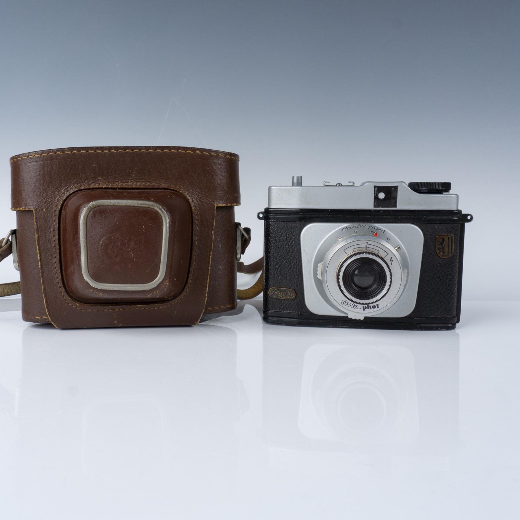 Vintage Certo Certo-Phot camera, made in Dresden, Germany during the 1950s by Certo Camera Company, renowned for its innovative and compact camera designs. This model features a metal body with black leatherette finish and includes its original leather case with strap. This collectible piece exemplifies mid-20th-century German craftsmanship and design.