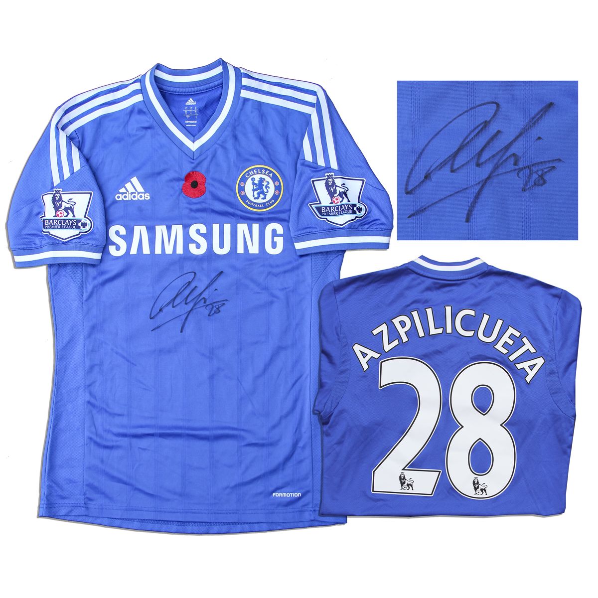 Cesar Azpilicueta match worn Chelsea football shirt signed. Soccer jersey was worn for the game against West Brom on 9 November 2013. Shirt features a red poppy flower as part of the yearly Poppy Appeal campaign, which honors British Armed Forces and veterans. Near fine. Provenance is from a charity auction benefiting The Royal British Legion, which provides support to the armed forces and their families. With a COA from the club.