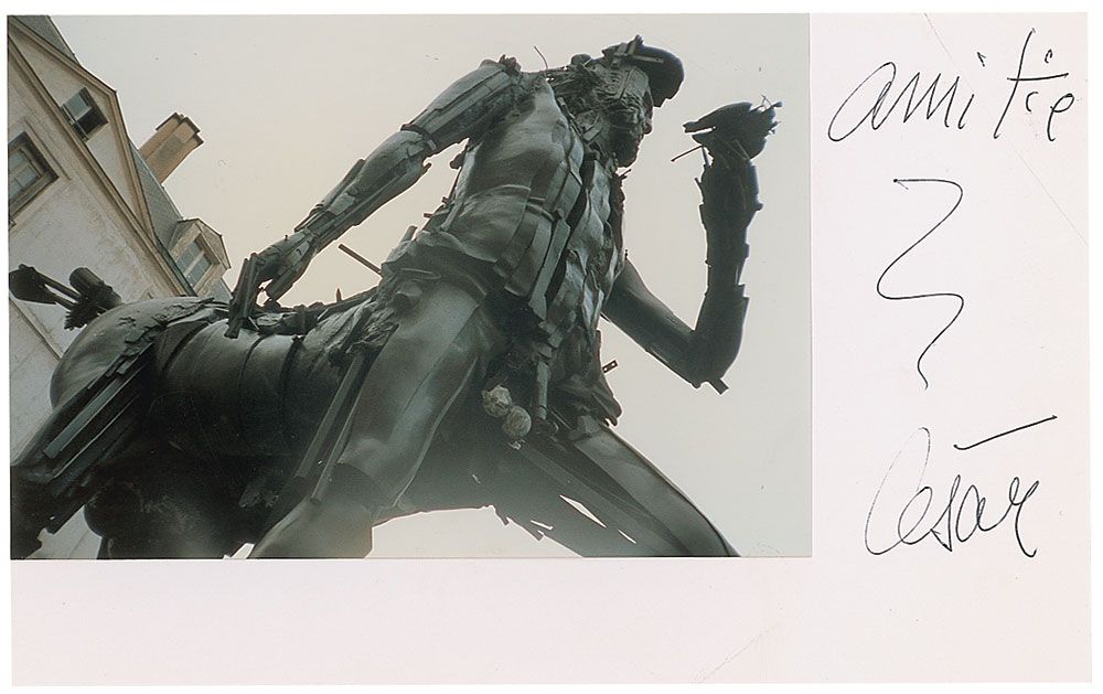 Noted French sculptor (1921–1998). Ballpoint signature, “Amitie, Cesar,” on an off-white 8 x 5 card with a photo of one of his works affixed to the left side. In fine condition, with scattered creasing to photo.