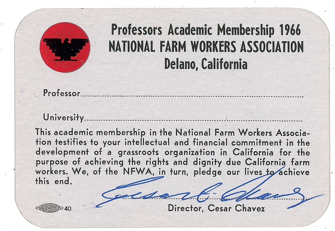 Unused academic membership card for the National Farm Workers Association, 1966, 3.5 x 2.5, signed at the bottom in blue ballpoint, "Cesar E. Chavez." In fine condition. Accompanied by a color copy of the letter sent to professors by the NFWA.