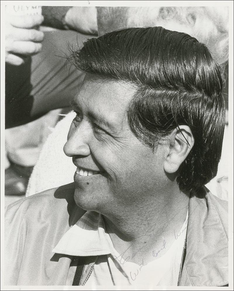 Farm worker, labor leader, and civil rights activist (1927–1993) who co-founded the United Farm Workers (UFW). Pearl-finish 8 x 10 head-and-shoulders photo of Chavez in a crowd, signed in black ballpoint. In very good condition, with rippling to all four edges, and signature and sentiment a couple shades light, but completely legible.
