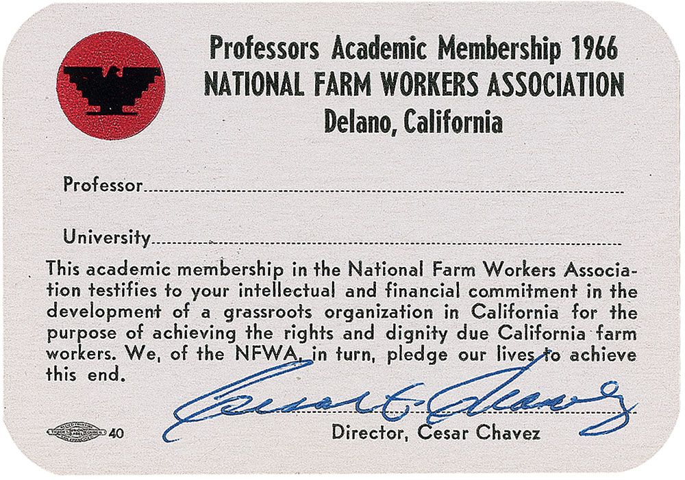 Farm worker, labor leader, and civil rights activist (1927–1993) who co-founded the United Farm Workers (UFW). Vintage unused academic membership card for the National Farm Workers Association, 1966, 3.5 x 2.5, signed at the bottom in blue ballpoint, “Cesar E. Chavez.” In fine condition.