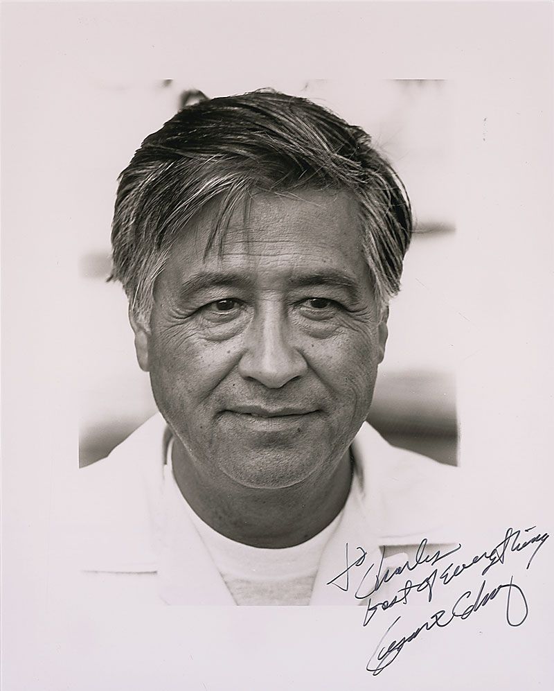 Glossy 8 x 10 head-and-shoulders photo, signed and inscribed in black felt tip, “To Charles, best of everything, Cesar Chavez.” In fine condition.