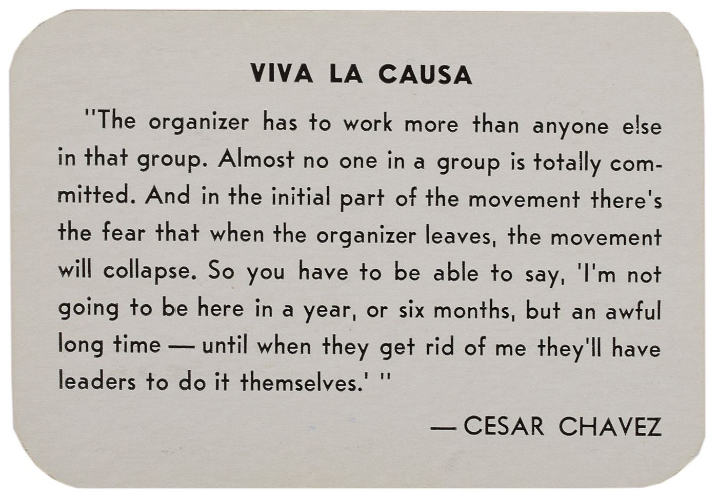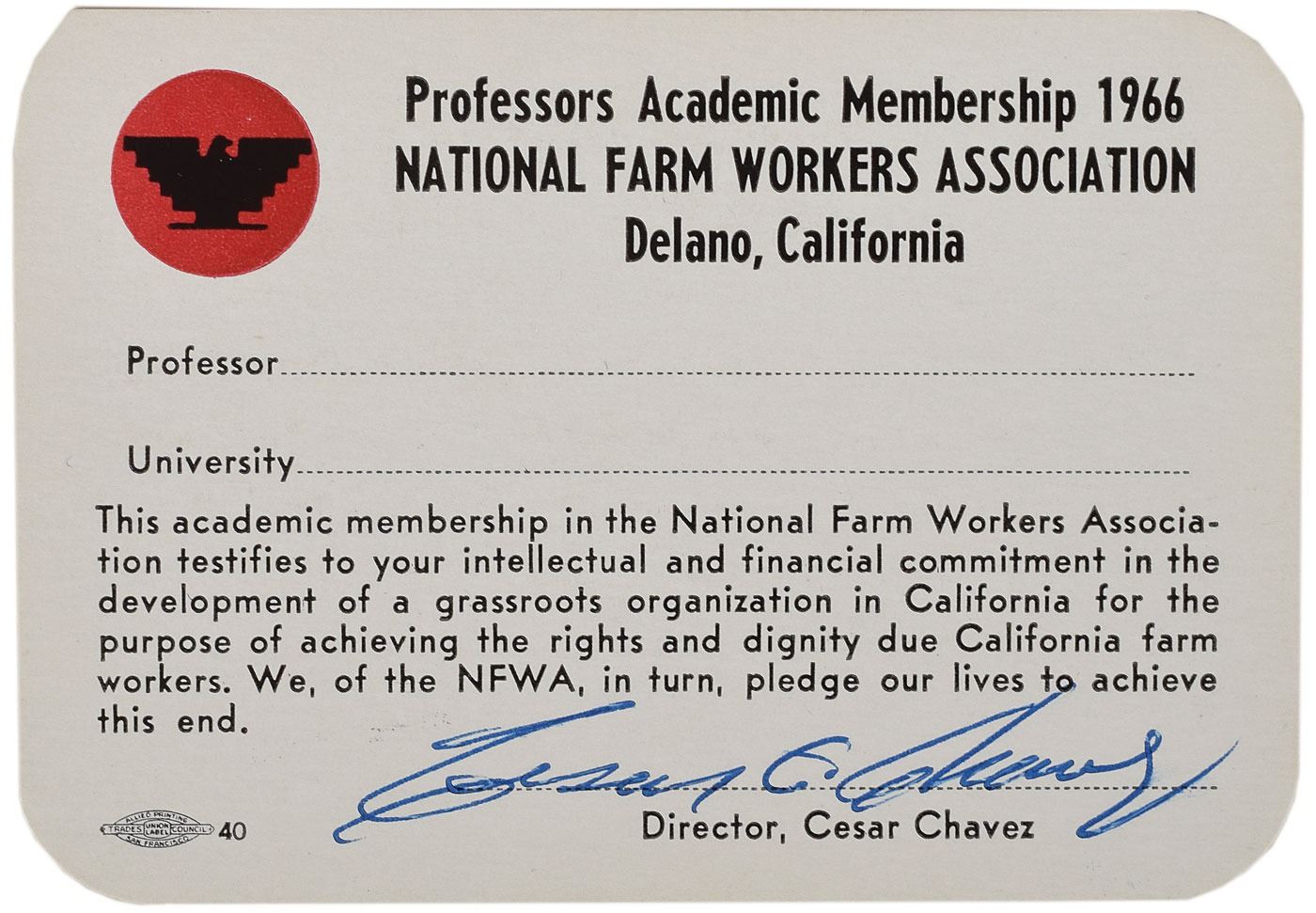 Unused academic membership card for the National Farm Workers Association, 1966, 3.5 x 2.5, signed at the bottom in ballpoint, "Cesar E. Chavez." In fine condition. Accompanied by a color copy of the letter sent to professors by the NFWA.