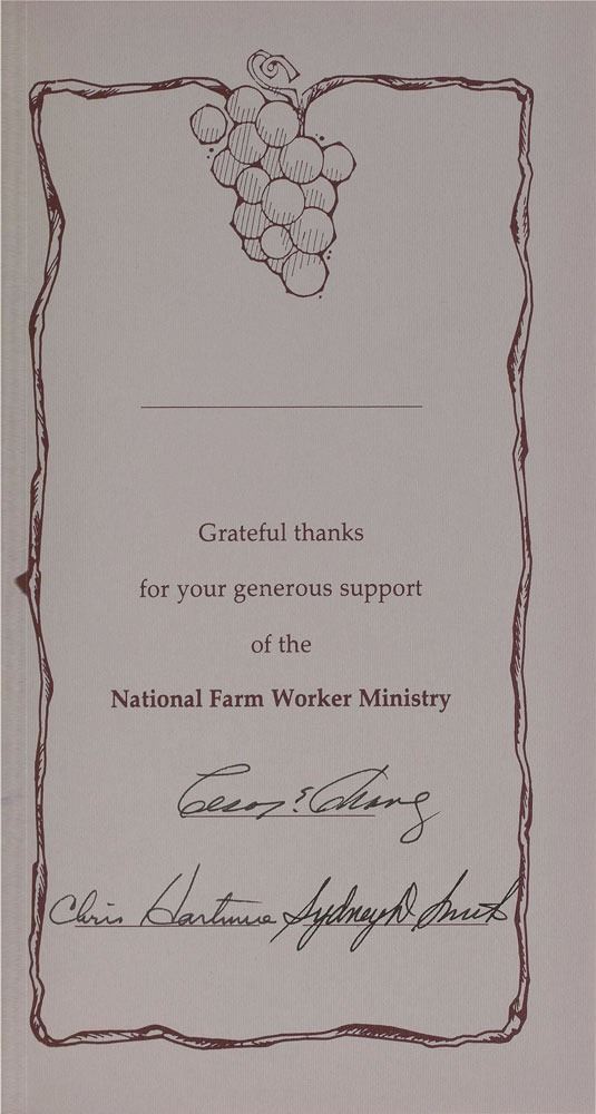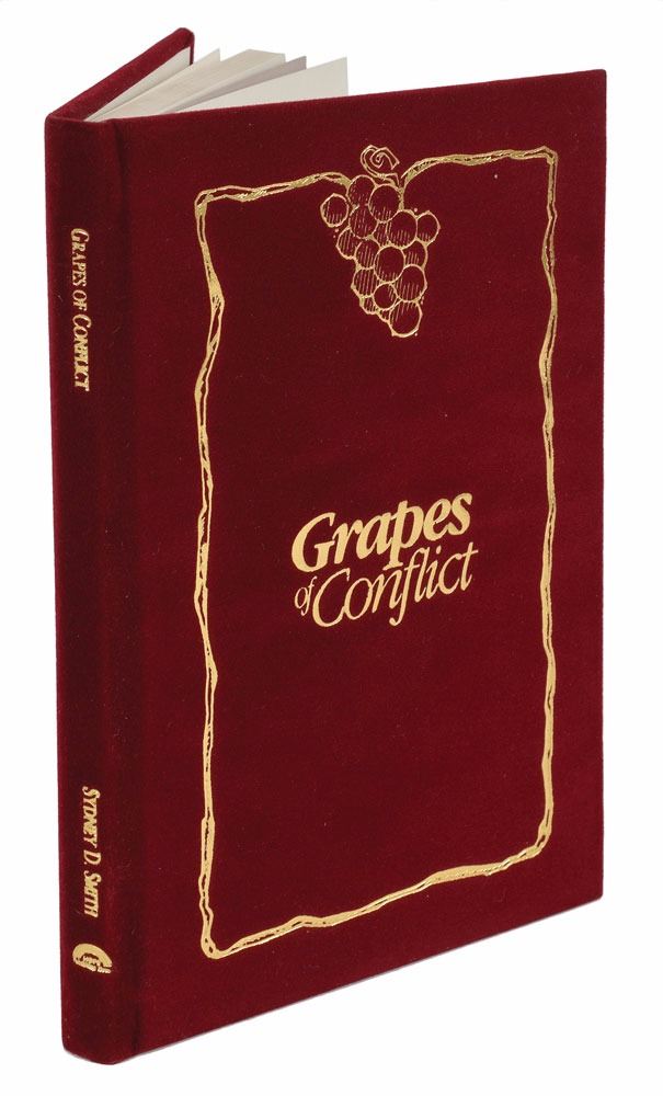Signed book: Grapes of Conflict. First edition. Pasadena, CA: Hope Publishing House, 1987. Maroon velveteen hardcover with gilt lettering, 5.5 x 8.75, 142 pages. Signed on a prefatory page in black ink by Chavez, Chris Hartmire, and the author, Sydney D. Smith. In very fine condition.