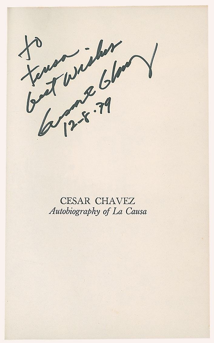 Signed book: Cesar Chavez: Autobiography of La Causa. First edition. NY: W. W. Norton & Company, 1975. Hardcover with dust jacket, 6.25 x 9.5, 546 pages. Signed and inscribed on the half-title page in black felt tip, "To Teresa, best wishes, Cesar E. Chavez, 12–8–79." In fine condition, with chips and tears to the dust jacket.