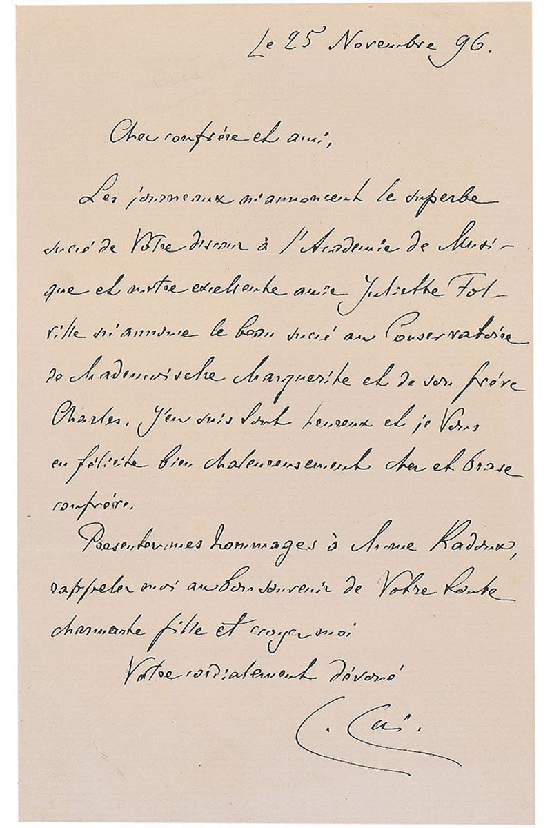 Army officer and composer (1835–1918) and a member of the group of Russian composers known as ‘The Five.’ ALS in French, signed “C. Cui,” one page, 5.25 x 8.25, November 25, 1896. Untranslated letter to a friend. In fine condition.