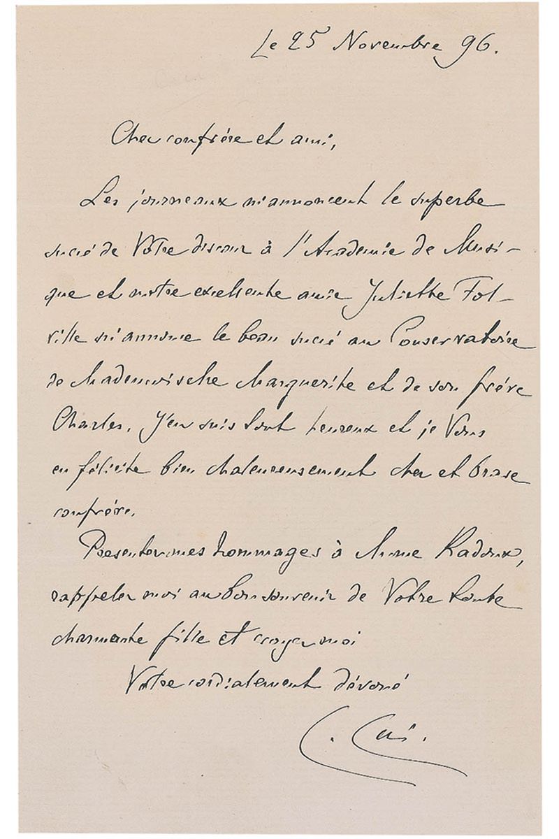 Army officer and composer (1835–1918) and a member of the group of Russian composers known as ‘The Five.’ ALS in French, signed “C. Cui,” one page, 5.25 x 8.25, November 25, 1896. Untranslated letter to a friend. In fine condition.