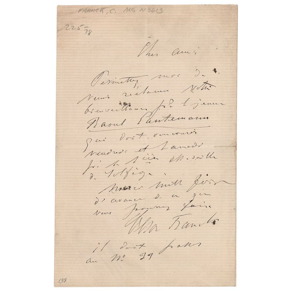 ALS in French, one page, 5.25 x 8.25, no date. Untranslated handwritten letter of introduction from Cesar Franck. In fine condition, with some light soiling.