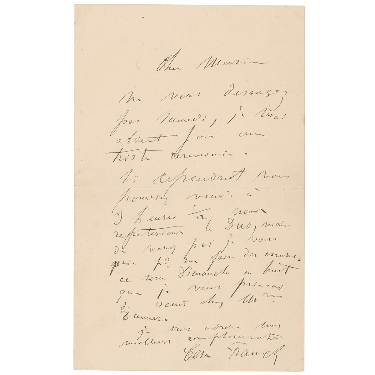 Composer and pianist (1822–1890) who drew to him a loyal and devoted circle of pupils and in 1871 won some official recognition as the nominated successor of Benoist as organ professor at the Conservatoire. ALS in French, one page, 4.5 x 7, no date. Letter to an unidentified gentleman. In full (translated): “Don’t worry about our Saturday meeting. I shall be absent because of a sad occasion. However, if you could come at 9:30 we would rehearse the duet. If you can’t make it, no apologies are necessary. We shall meet a week from Sunday, and I ask that you please come to Madame Dauner’s home.” In fine condition, with a central horizontal fold and a uniform shade of mild toning.