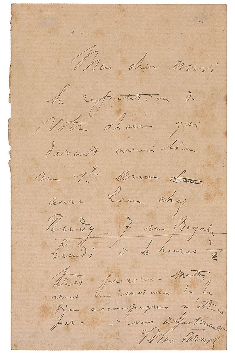 Composer and pianist (1822–1890) who drew to him a loyal and devoted circle of pupils and in 1871 won some official recognition as the nominated successor of Benoist as organ professor at the Conservatoire. Untranslated ALS in French, one page, 5 x 8, no date. In very good condition, with central vertical and horizontal folds and heavy overall foxing and staining.
