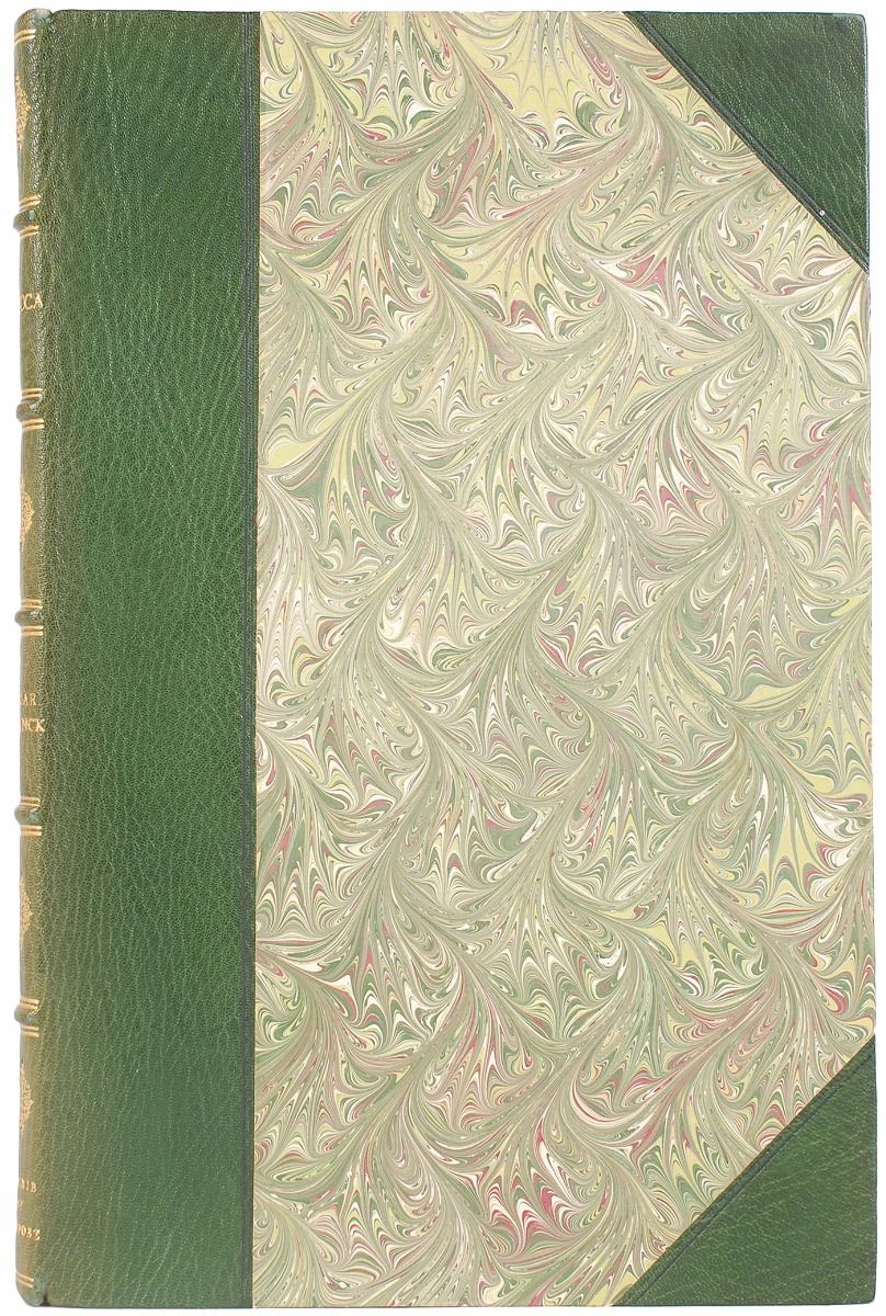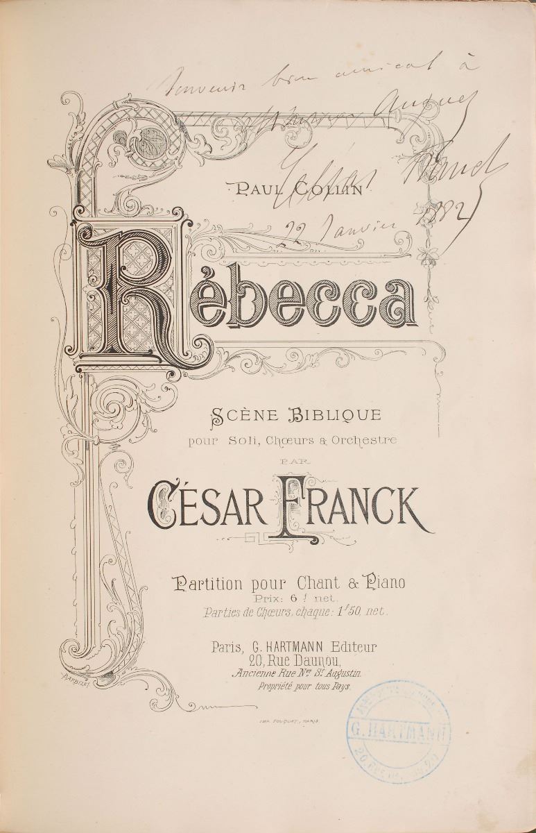 Composer and pianist (1822–1890) who won some official recognition as the nominated successor of Benoist as organ professor at the Conservatoire. Sheet music booklet for Rebecca published by G. Hartmann in Paris, 72 pages, 7.75 x 11.25, signed and inscribed on the title page in French in crisp black ink by Franck, and dated January 22, 1882. Beautifully half-bound in leather with marbled boards and gilt-stamped spine, retaining the original wrappers inside. In fine condition.