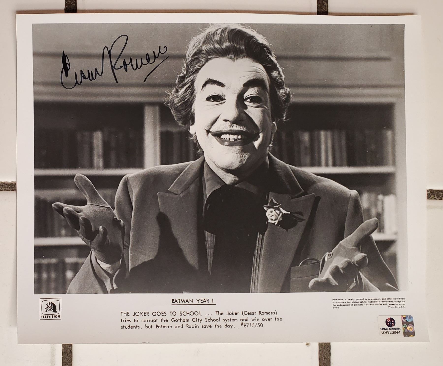 An 8” x 10” photograph signed by Cesar Romero. The autograph is authenticated by Global Authentics who issued a COA numbered GV 923644.