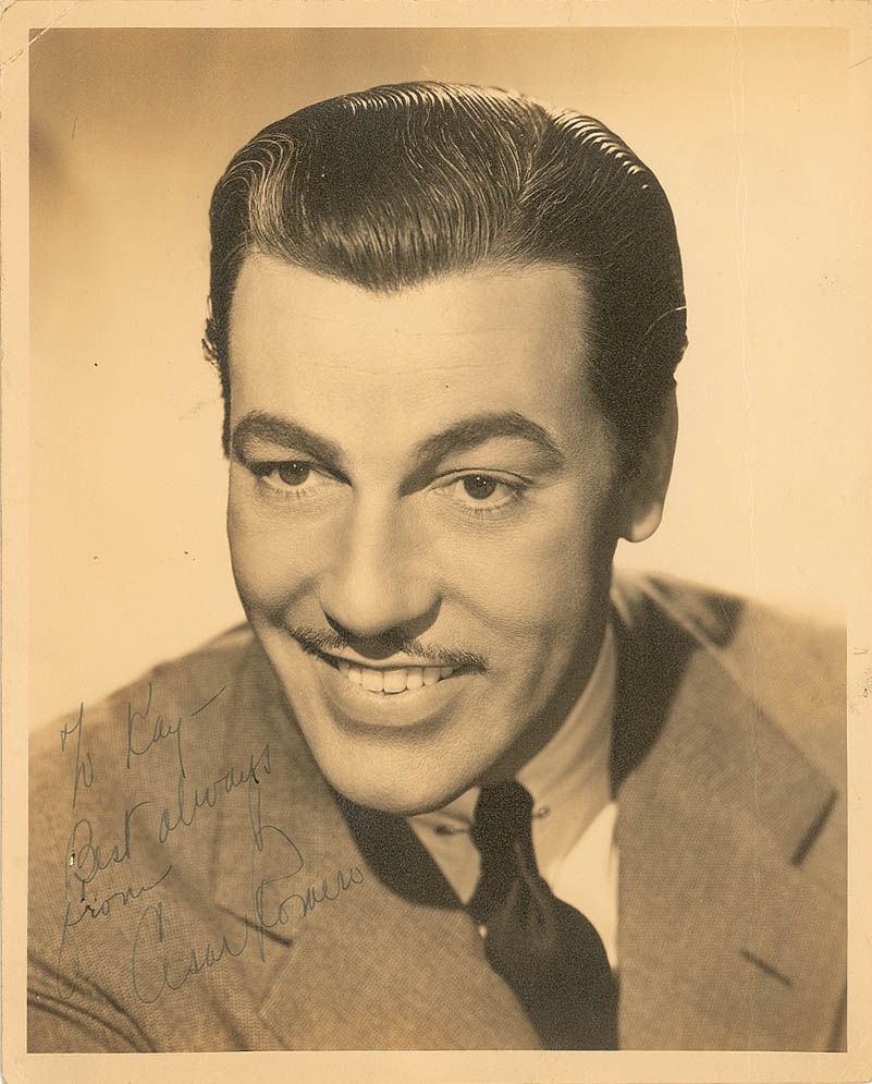 Vintage matte-finish 8 x 10 head-and-shoulders photo, signed and inscribed in black ink “To Kay—Best wishes from Cesar Romero.” In very good condition, with several creases, rippling to horizontal edges, a bit of light silvering, and signature and inscription a shade light.