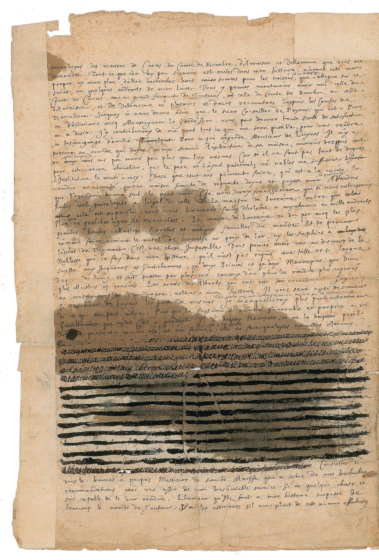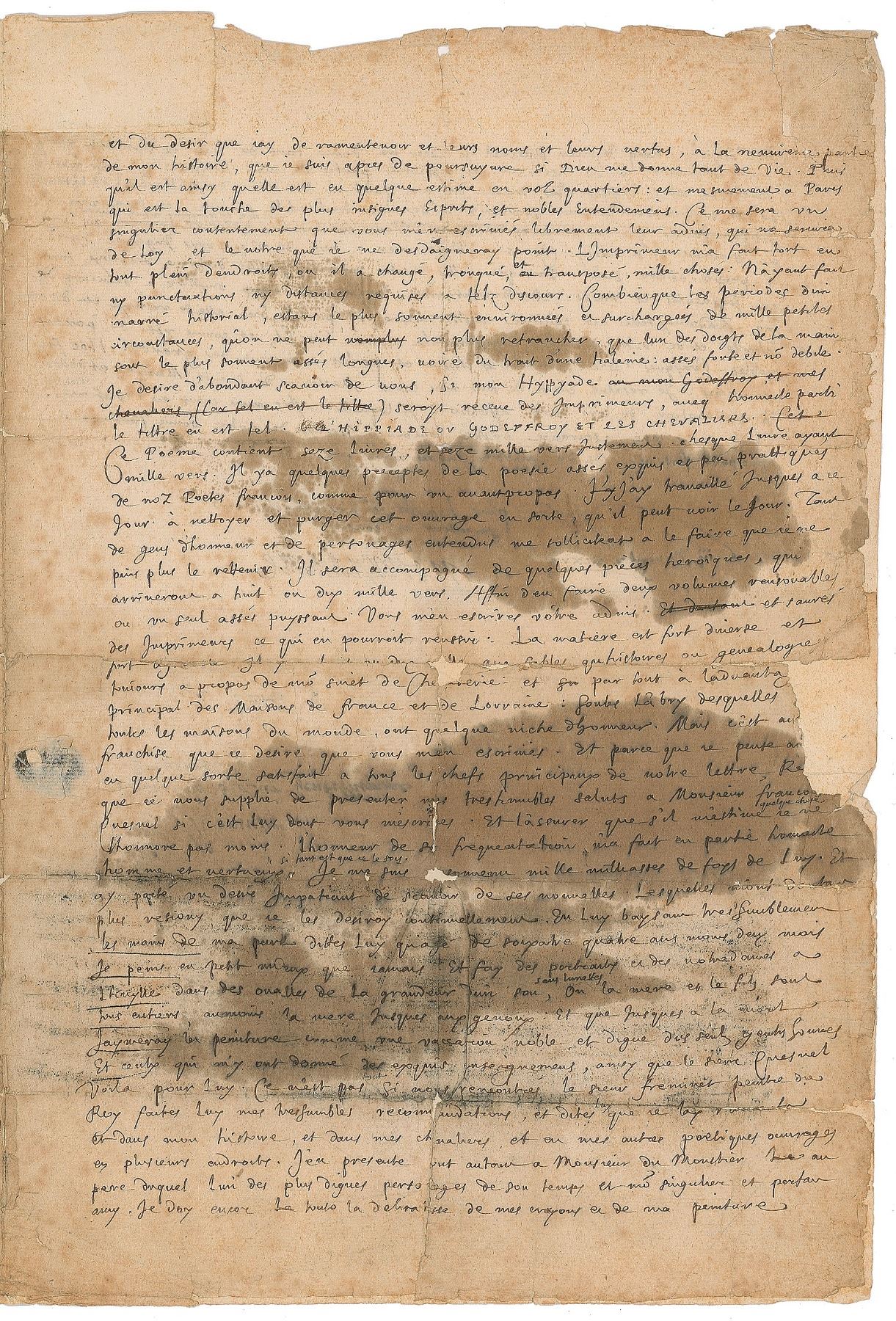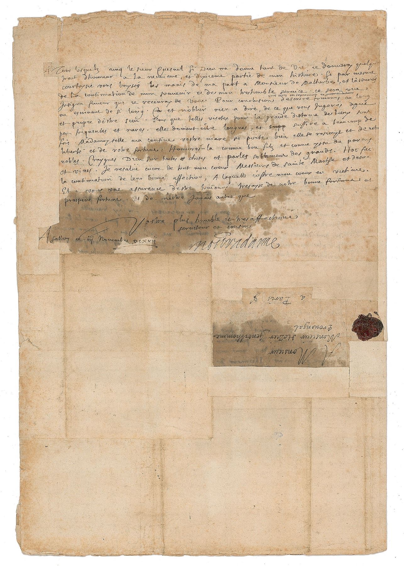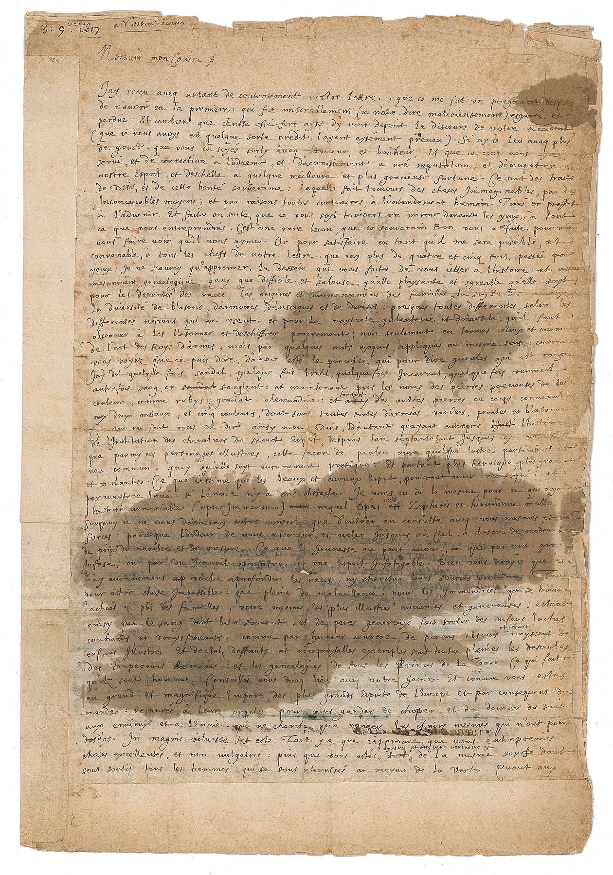 Early French historian, poet, and painter (1553–1629) who was the son of the famed astrologer and reputed seer Nostradamus. LS in French, signed “Nostredame,” four pages on two adjoining sheets, 9.25 x 14, November 3, 1617. Letter to his cousin, Pierre d'Hozier, an early genealogist. Hozier had told Nostradame about the plan to devote himself to the history and genealogy, and asked him for advice and genealogical information. In this reply, Nostredame describes in detail his contributions to the descriptions of coats of arms. He also mentions also a newly written heroic poem, for which he would like to find a publisher, possibly with the help of Hozier. In good condition, with tears, areas of heavy staining, and several old repairs, including reconstruction of the bottom half of the final page.