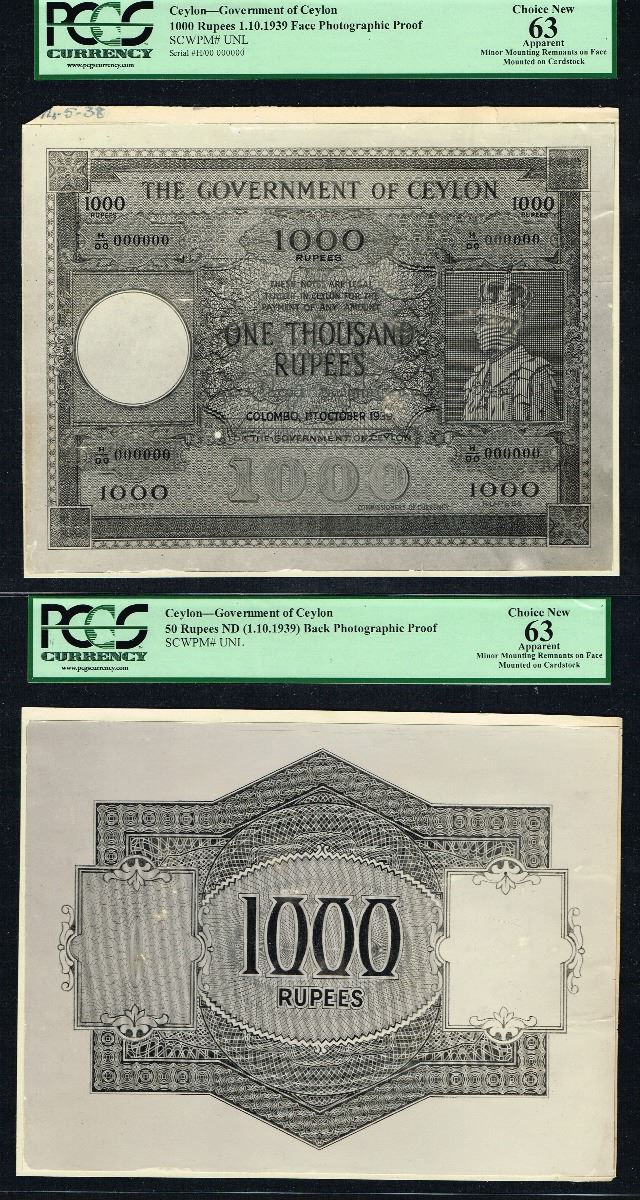 Ceylon, 1000 Rupees, 1.10.1939, UNL, PHOTOGRAPHIC ESSAY, Government of Ceylon, SL# H/00-000000, PCGS 63 UNC