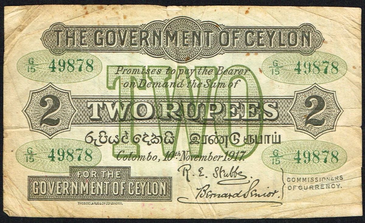 Ceylon, 2 Rupees, 10th Nov 1917, Pick# 18, Government of Ceylon, SL# G/15-49878, FINE