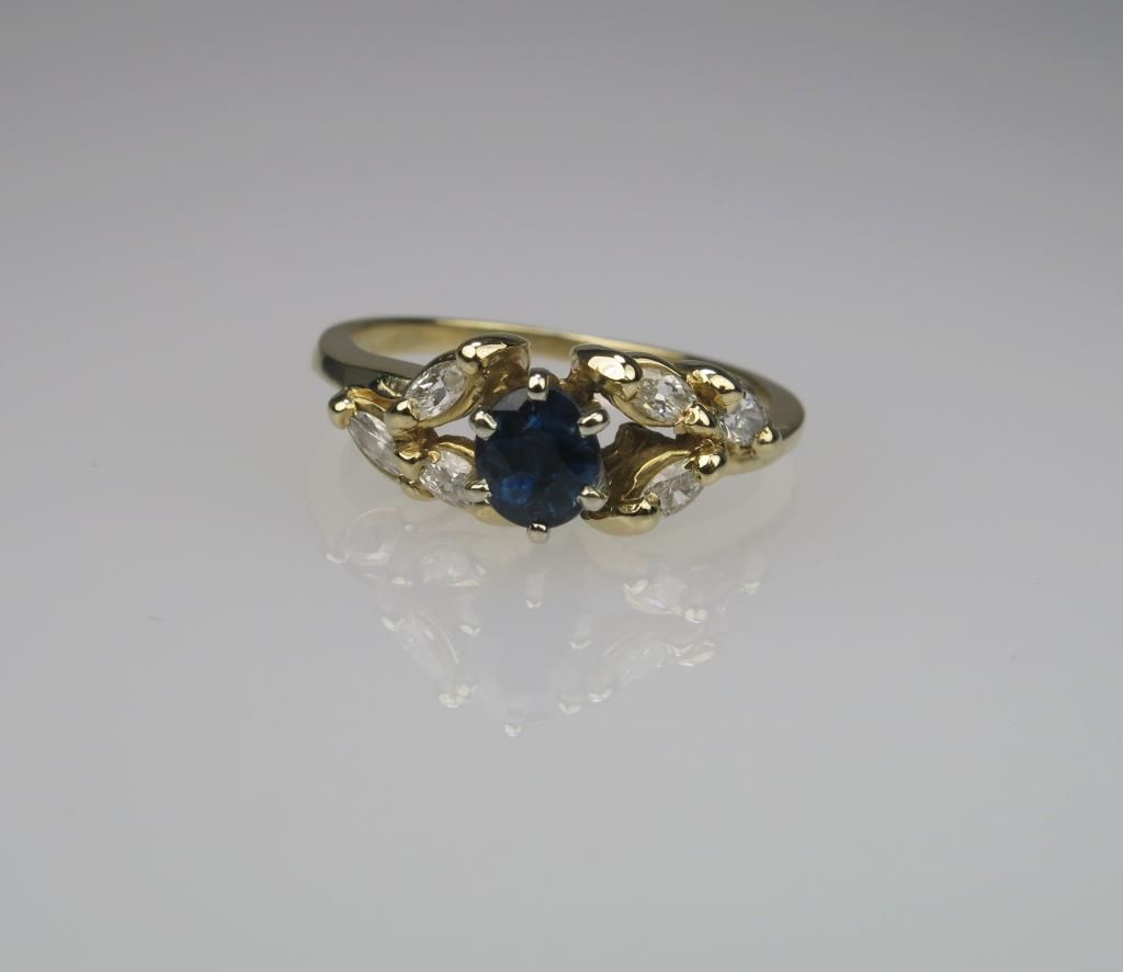 Round cut vivid blue Sapphire weighing approx. 0.75 carats accented with 6 marquise cut Diamonds weighing approx. 0.60 carats set in 14 karat yellow gold.