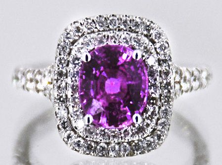 14kt White Gold 3.28 Approx grams including,2.02ct Vivid Pink Sapphire Cushion cut, .79ctw Round Diamond G-H color VS-SI clarity, size 6