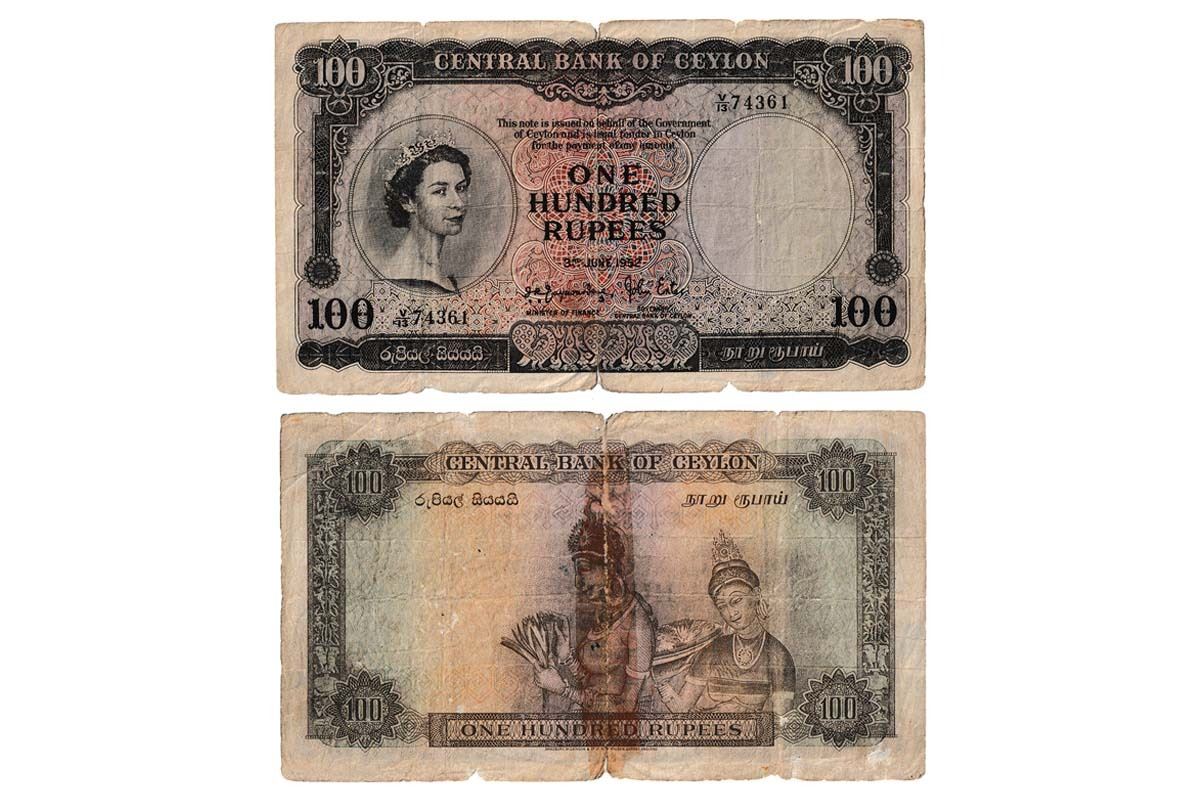 Ceylon, Queen Elizabeth II (c. 1952-date), 100 Rupees, 3rd June 1952 issue, Obv. Front-facing portrait of Queen Elizabeth, Rev. Ceylon women in national dress, (P#53), Fine, Very Rare.