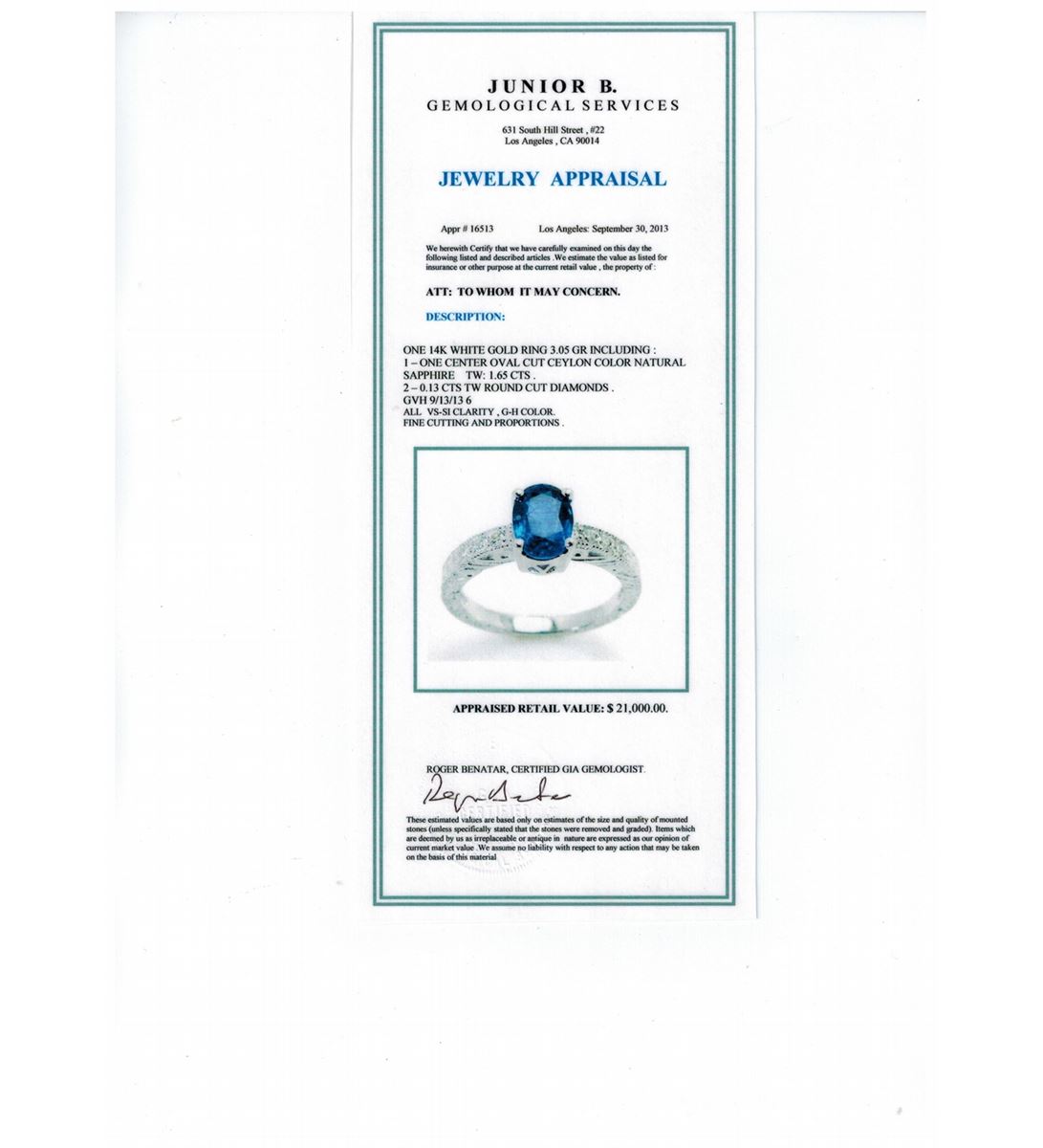 14kt White Gold 3.05 Approx grams including, 1.65ct Ceylon Blue Sapphire Oval, .13ctw Round Diamond G-H color VS-SI clarity,size 6