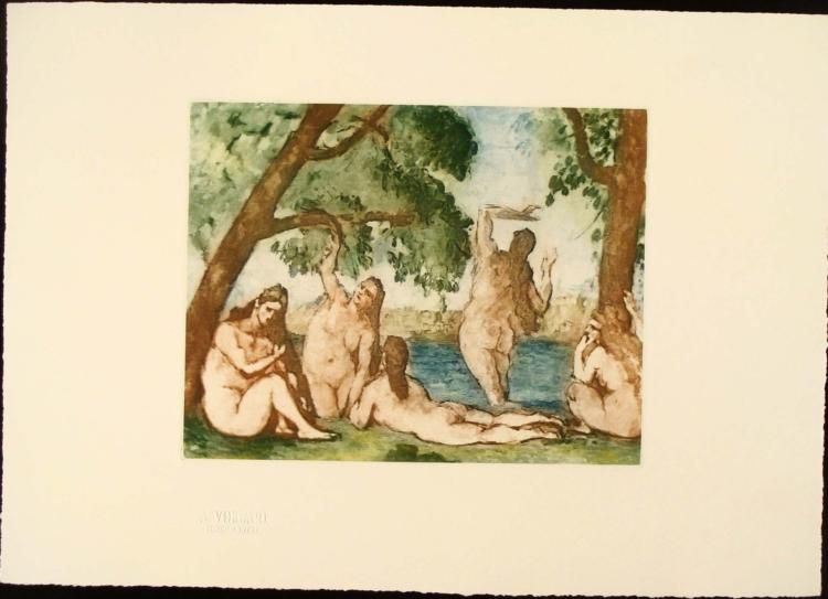 Be free ladies, be free!!Artist: Cezanne Title: Bathers (five) Medium: Colored Etching on paper Blind Stamp by Amroise Vollard Estate Size of Image: 7 3/4" x 9 3/4" Size of Paper: 12 1/2" x 17 5/8" Condition: Very Good BibliographyCézanne's work demonstrates a mastery of design, colour, tone, composition and draughtsmanship. His often repetitive, sensitive and exploratory brushstrokes are highly characteristic and clearly recognizable. He used planes of colour and small brushstrokes that build up to form complex fields, at once both a direct expression of the sensations of the observing eye and an abstraction from observed nature. The paintings convey Cézanne's intense study of his subjects, a searching gaze and a dogged struggle to deal with the complexity of human visual perception.From website: http://en.wikipedia.org/wiki/Paul_C%C3%A9zanne