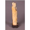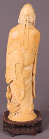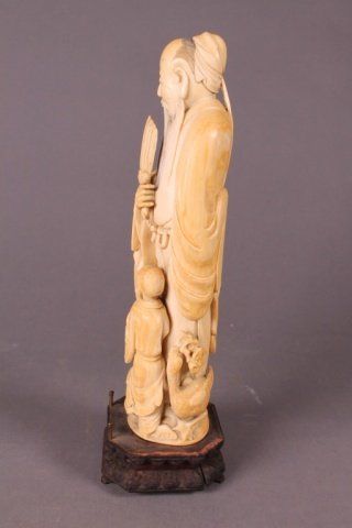 A Chinese carved ivory figure, possibly Zhong Li-Quan, holding a fan. Child and goose stand at his feet. 19th century. Affixed to wooden base. 9 1/2"h x 2 3/4"w x 2 1/4"d.