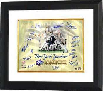 The New York Yankees' 1998 season was the 96th season for the Yankees. The team finished with a franchise record regular-season standing of 114–48. In the postseason, they swept the Texas Rangers in the American League Division Series, won the American League pennant by beating the Cleveland Indians four games to two in the American League Championship Series, and swept the San Diego Padres to capture their 24th World Series. Including the playoffs, the 1998 Yankees won a total of 125 games against 50 losses, an MLB record. They are widely considered to be one of the greatest teams in baseball history. The 125 wins (regular season and playoffs combined) was the most by a championship team, surpassing the previous record of 116, set by their cross-town rivals, New York Mets in 1986. This 1998 Yankees Celebration Collage 16x20 Photo is signed by: Scott Brosius w/MVP insc, Darryl Strawberry, Chad Curtis, Mike Stanton, Todd Erdos, Shane Spencer, Mike Jerzembeck, Willie Banks, Jim Bruske, Jose Cardenal, Ryan Bradley, Ramiro Mendoza, Jay Tessmer, Mike Vigga, Homer Bush, Jeff Nelson, Mike Buddie and Chili Davis. Leaf Authentics Hologram and Certificate of Authenticity from Athlon Sports. Custom White Mat and Premium Black Frame as shown.