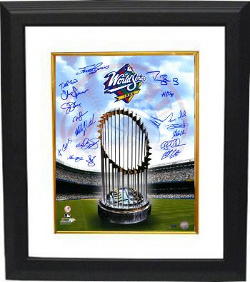 The New York Yankees' 1998 season was the 96th season for the Yankees. The team finished with a franchise record regular-season standing of 114–48. In the postseason, they swept the Texas Rangers in the American League Division Series, won the American League pennant by beating the Cleveland Indians four games to two in the American League Championship Series, and swept the San Diego Padres to capture their 24th World Series. Including the playoffs, the 1998 Yankees won a total of 125 games against 50 losses, an MLB record. They are widely considered to be one of the greatest teams in baseball history. The 125 wins (regular season and playoffs combined) was the most by a championship team, surpassing the previous record of 116, set by their cross-town rivals, New York Mets in 1986. This 1998 Yankees World Series Logo and Trophy 16x20 Photo is signed by: Scott Brosius w/MVP insc, Darryl Strawberry, Chad Curtis, Mike Stanton, Todd Erdos, Shane Spencer, Mike Jerzembeck, Willie Banks, Jim Bruske, Jose Cardenal, Ryan Bradley, Ramiro Mendoza, Jay Tessmer, Mike Vigga, Homer Bush, Jeff Nelson, Mike Buddie and Chili Davis. Leaf Authentics Hologram and Certificate of Authenticity from Athlon Sports. Custom White Mat and Premium Black Frame as shown.