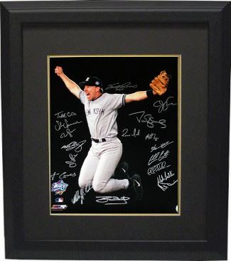 The New York Yankees' 1998 season was the 96th season for the Yankees. The team finished with a franchise record regular-season standing of 114–48. In the postseason, they swept the Texas Rangers in the American League Division Series, won the American League pennant by beating the Cleveland Indians four games to two in the American League Championship Series, and swept the San Diego Padres to capture their 24th World Series. Including the playoffs, the 1998 Yankees won a total of 125 games against 50 losses, an MLB record. They are widely considered to be one of the greatest teams in baseball history. The 125 wins (regular season and playoffs combined) was the most by a championship team, surpassing the previous record of 116, set by their cross-town rivals, New York Mets in 1986. This 1998 Yankees Scott Brosius 16x20 Photo is signed by: Scott Brosius w/MVP insc, Darryl Strawberry, Chad Curtis, Mike Stanton, Todd Erdos, Shane Spencer, Mike Jerzembeck, Willie Banks, Jim Bruske, Jose Cardenal, Ryan Bradley, Ramiro Mendoza, Jay Tessmer, Mike Vigga, Homer Bush, Jeff Nelson, Mike Buddie and Chili Davis. Leaf Authentics Hologram and Certificate of Authenticity from Athlon Sports. Custom Black Mat and Premium Black Frame as shown.