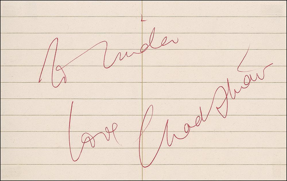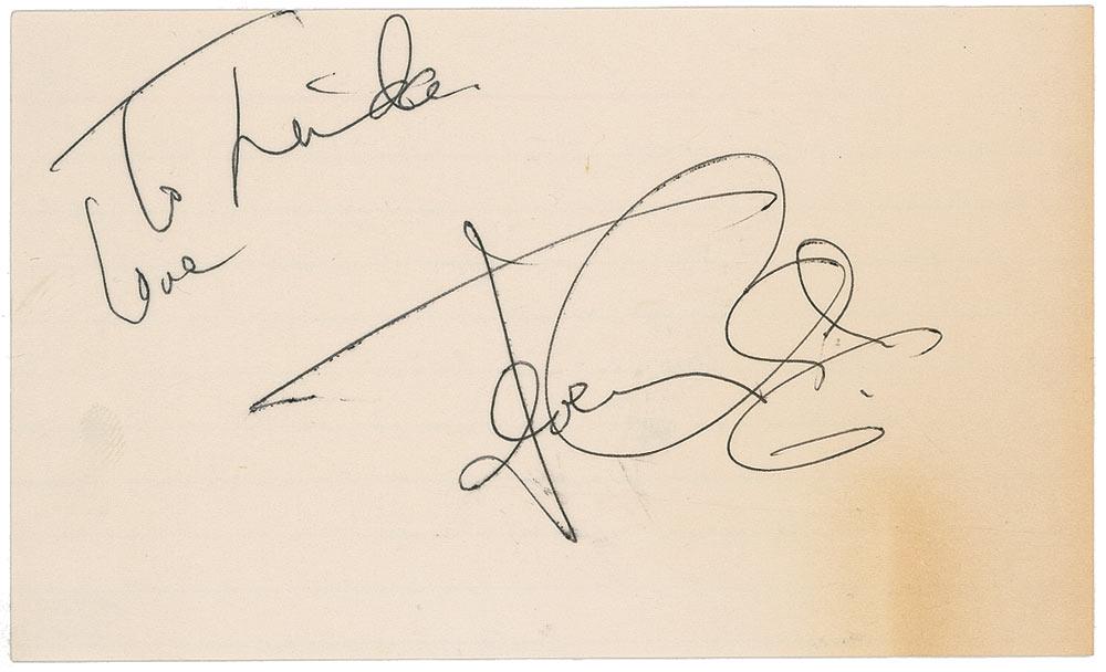 Ballpoint signature and inscription, “To Linda, Love, Chad Stuart,” on an off-white 6 x 3.75 lined slip; and a ballpoint signature, “To Linda, Love, Jeremy Clyde,” on an off-white 5 x 3 card. In fine condition, with toning to right side of Clyde’s signature. RRAuction COA.
