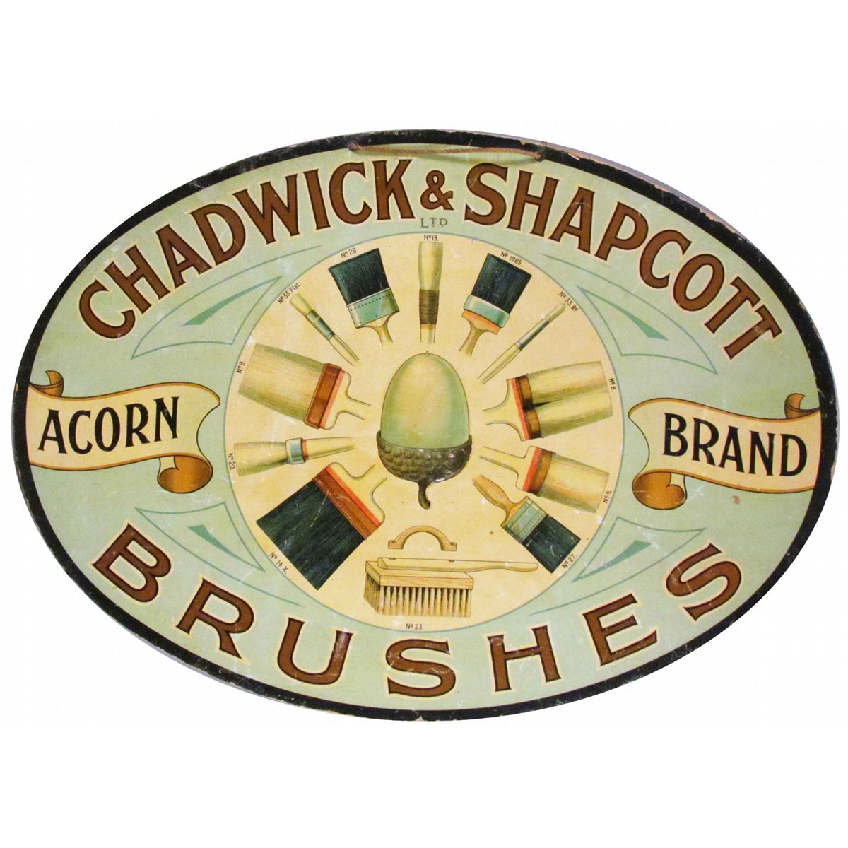 Chadwick & Shapcott Brushes Die Cut Embossed Cardboard String Hanging Sign for Acorn Brand paint brushes. The only one we have ever seen. A few rubs and slight discoloration otherwise very good condition. 18 X 13 inches.